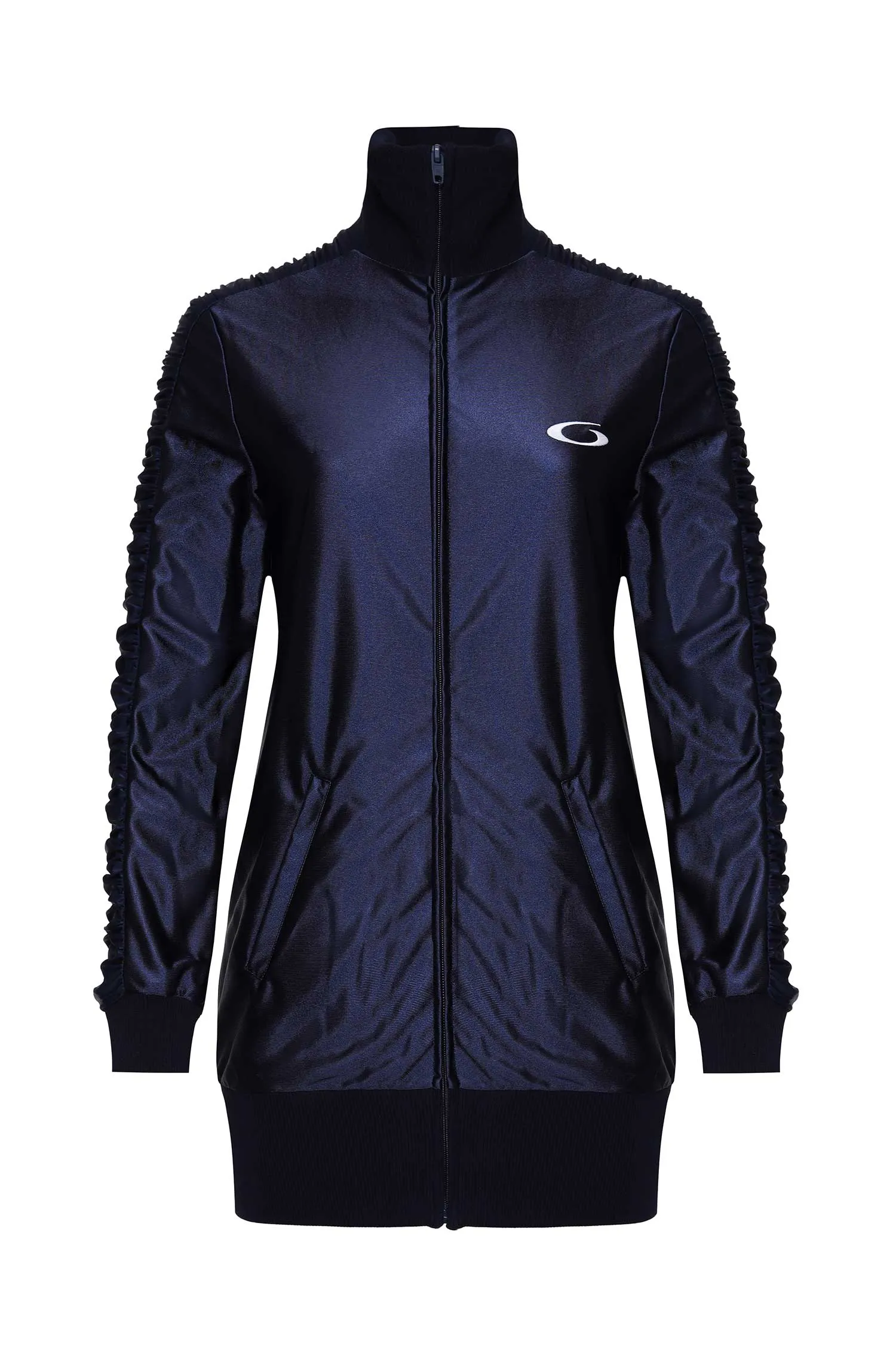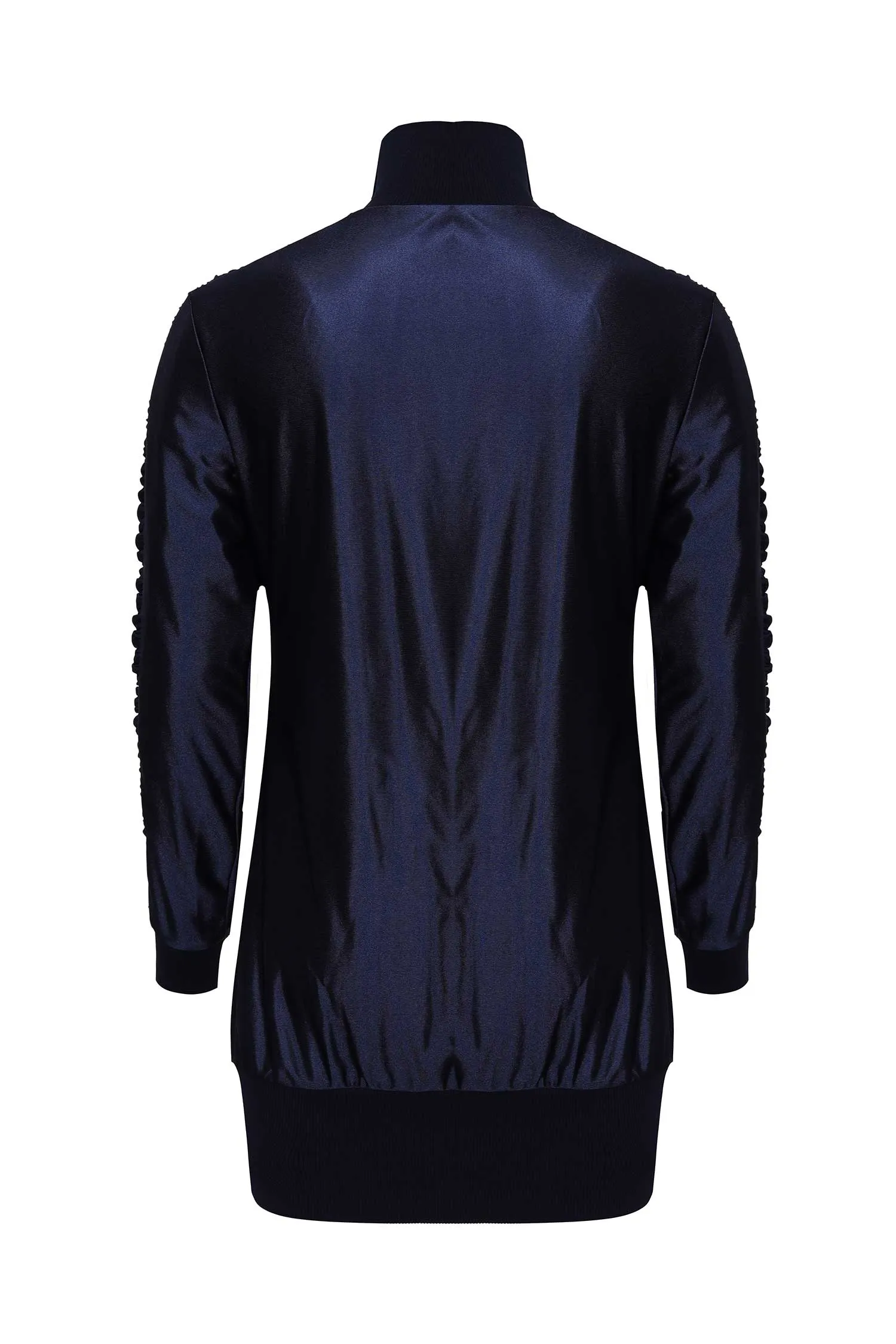 Темно-синее платье Balenciaga в спортивном стиле подчеркивает фигуру за счёт приталенного силуэта и блестящей текстуры ткани. Высокий ворот-стойка и молния спереди придают образу динамику, а карманы на молнии добавляют практичности. Лаконичное лого на груди завершает минималистичный дизайн, превращая платье в актуальную альтернативу классическому спортивному костюму.