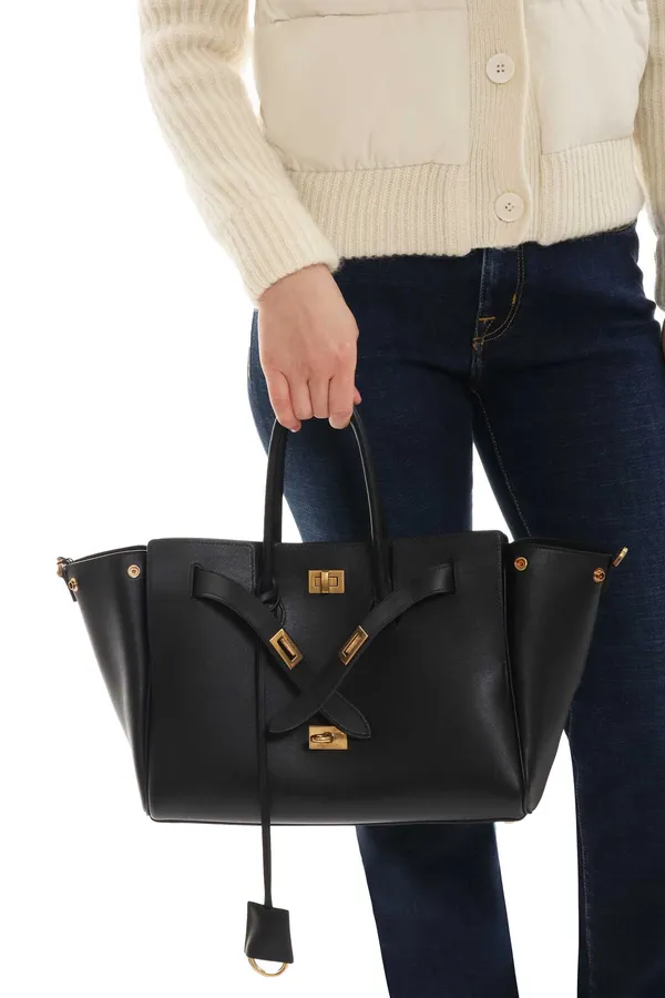 Сумка Bel Air Carry All выполнена из гладкой телячьей кожи и создана как универсальная модель на каждый день. Две ручки и съёмный регулируемый ремень позволяют носить её разными способами. В конструкции — поворотный замок, широкий внешний карман под клапаном, боковые кнопки для регулировки объёма. Внутри расположены основное отделение, два кармана на молнии и плоские секции. Подкладка выполнена из мягкой кожи ягнёнка.