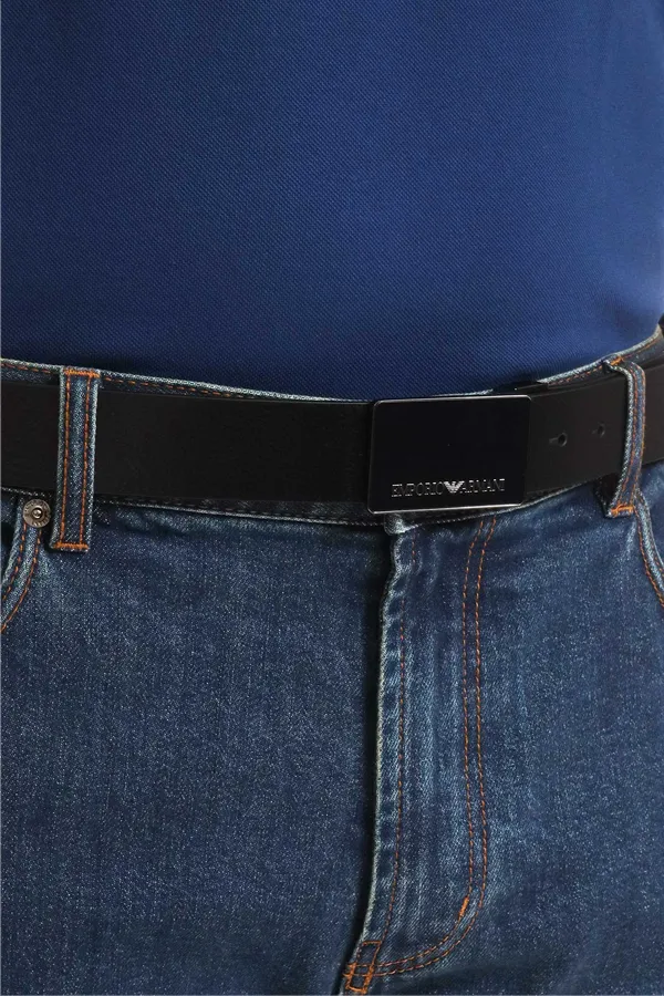 РЕМЕНЬ ЧЁРНЫЙ, ПРЯМОУГОЛЬНАЯ ПРЯЖКА, СЕРЕБРИСТАЯ ЛОГО-НАДПИСЬ, Ш=3,5
