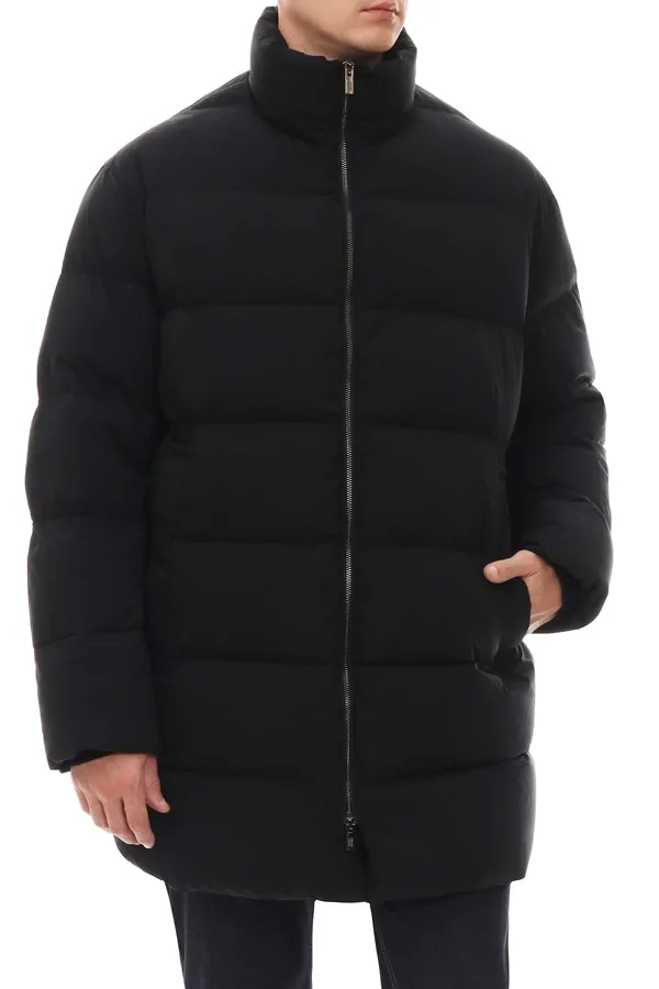 Удлинённый пуховик Emporio Armani воплощает современный минимализм и практичность. Стёжка подчёркивает графичность силуэта, а воротник-стойка придаёт образу структурность. Лёгкий пуховый наполнитель обеспечивает комфорт и тепло без утяжеления, делая модель универсальной для городских будней.