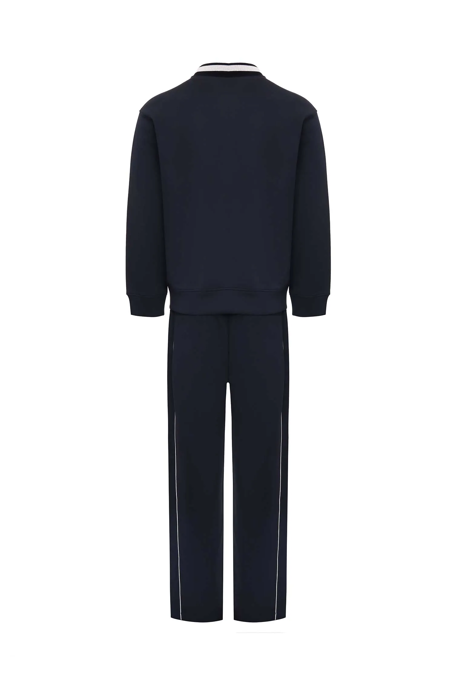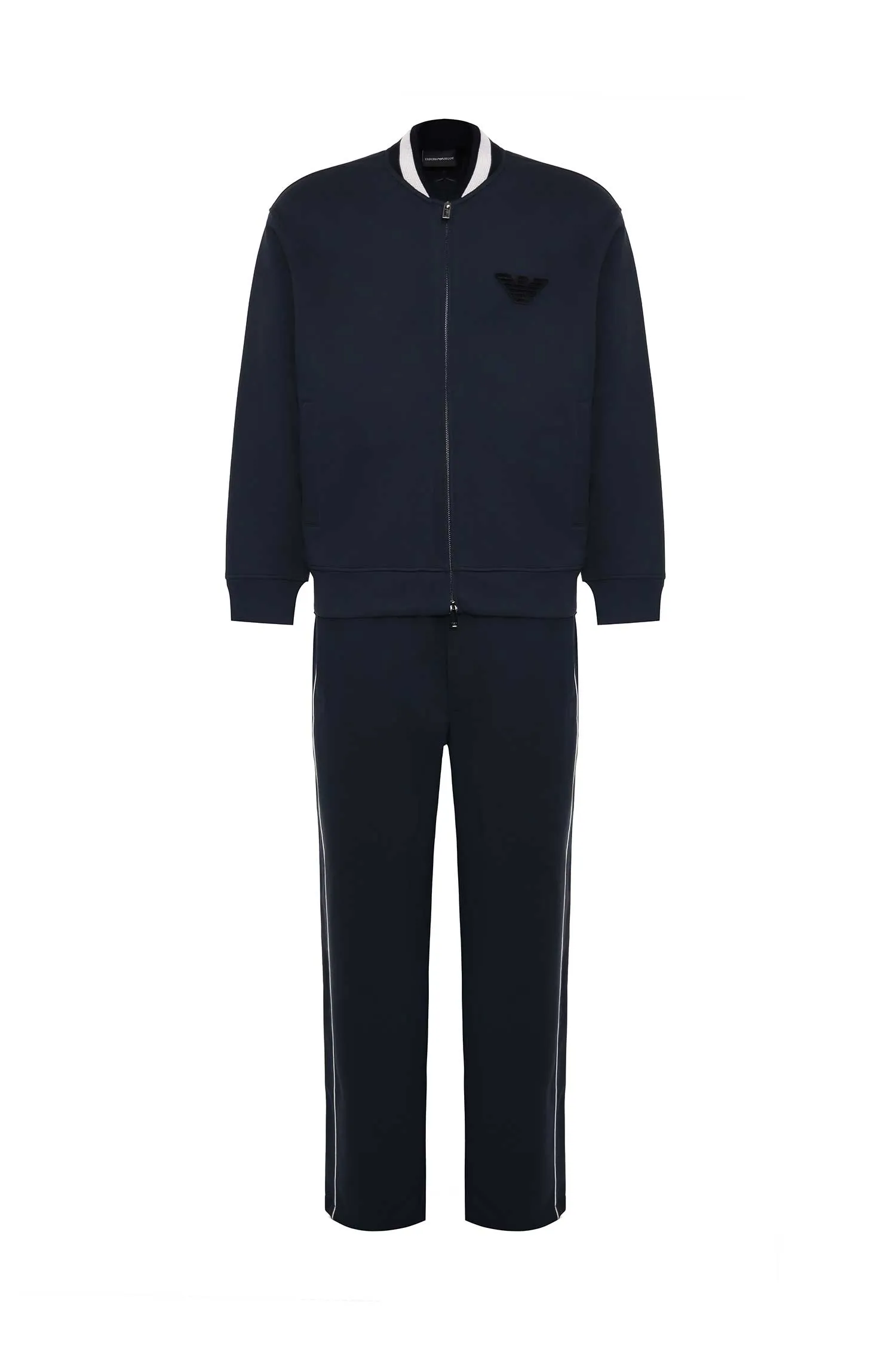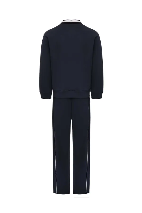 КОСТЮМ Т/СИНИЙ, ОЛИМПИЙКА+ШТАНЫ ПРЯМЫЕ, ТРИКОТАЖНЫЙ ВОРОТ, БАРХАТНОЕ ЛОГО, БЕЛЫЕ ЛАМПАСЫ