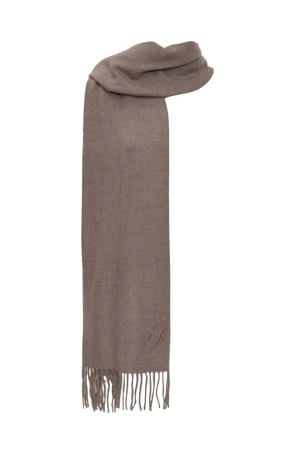 ШАРФ СЕРО-БЕЖЕВЫЙ ШЕРСТЬ, ВЫШИТОЕ ЛОГО В ТОН, БАХРОМА