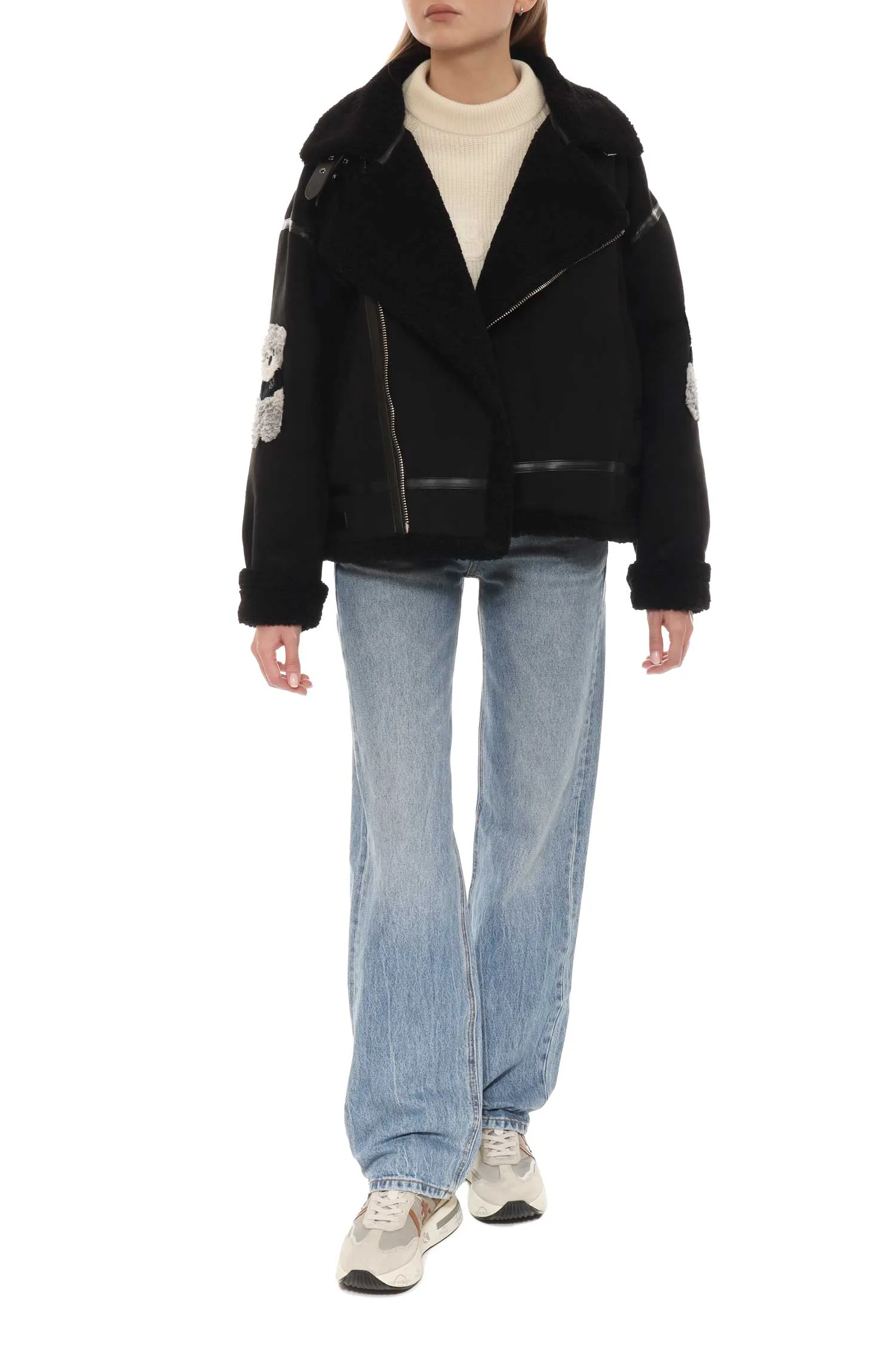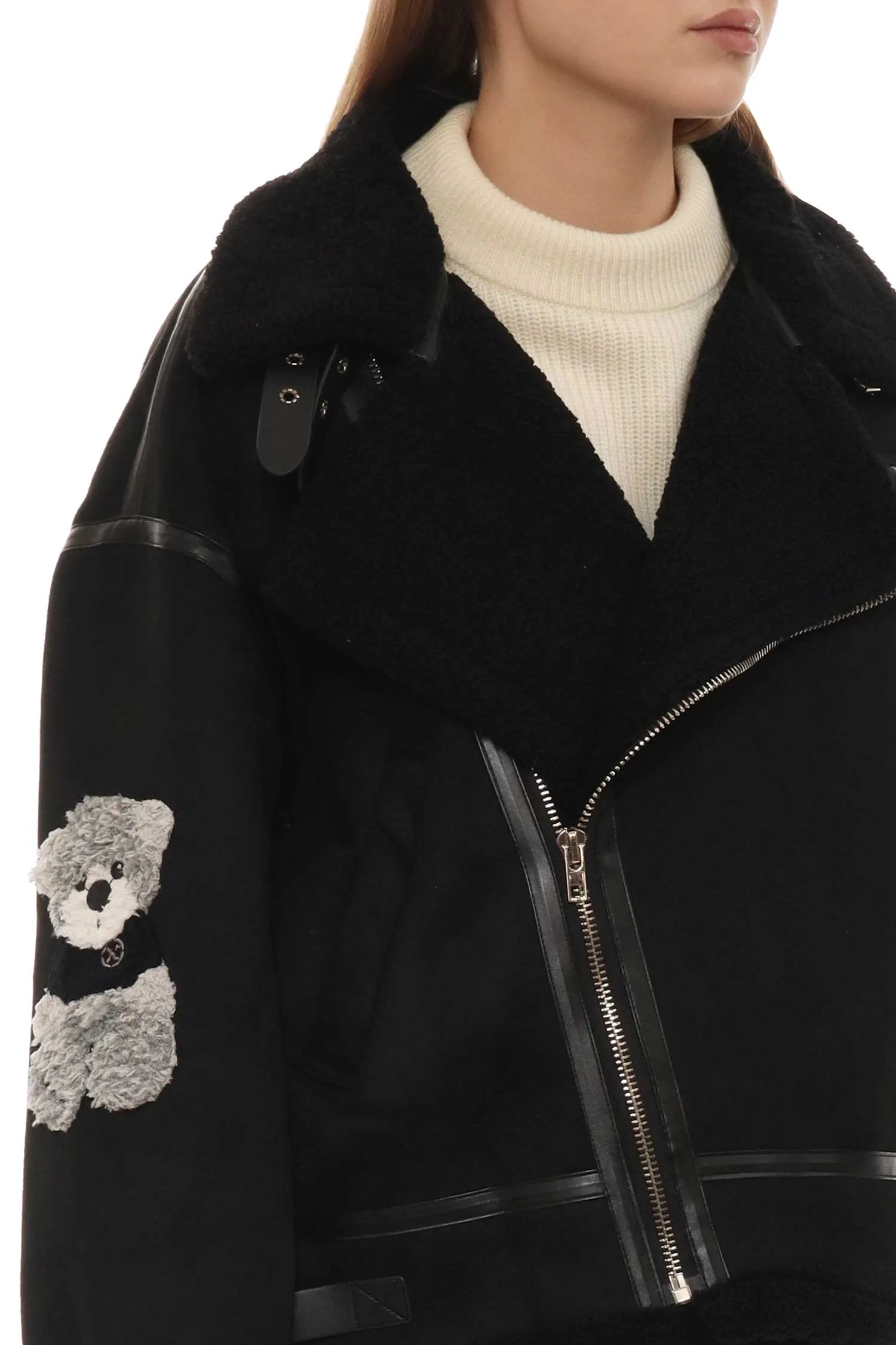 ДУБЛЁНКА-КОСУХА M.075 ЧЁРНАЯ, НА СПИНЕ И РУКАВАХ СЕРЫЕ НАШИВКИ МИШКИ