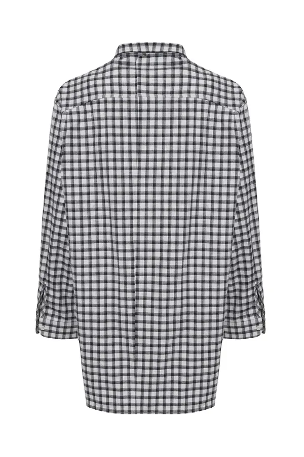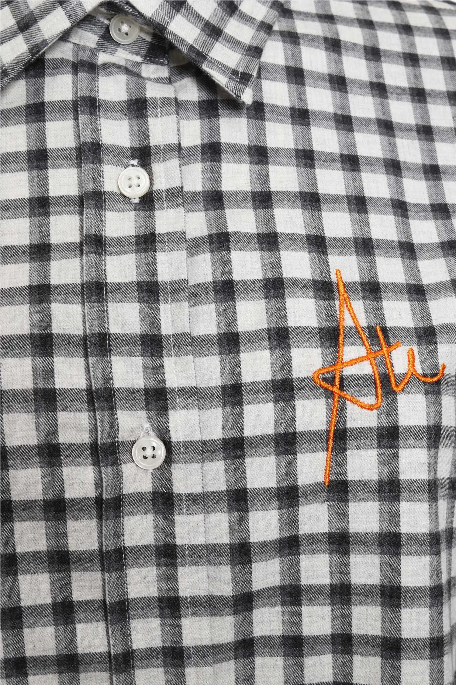 РУБАШКА СЕРО-БЕЛАЯ В КЛЕТКУ, СВОБОДНАЯ, НА ГРУДИ ВЫШИТОЕ ОРАНЖЕВОЕ ЛОГО