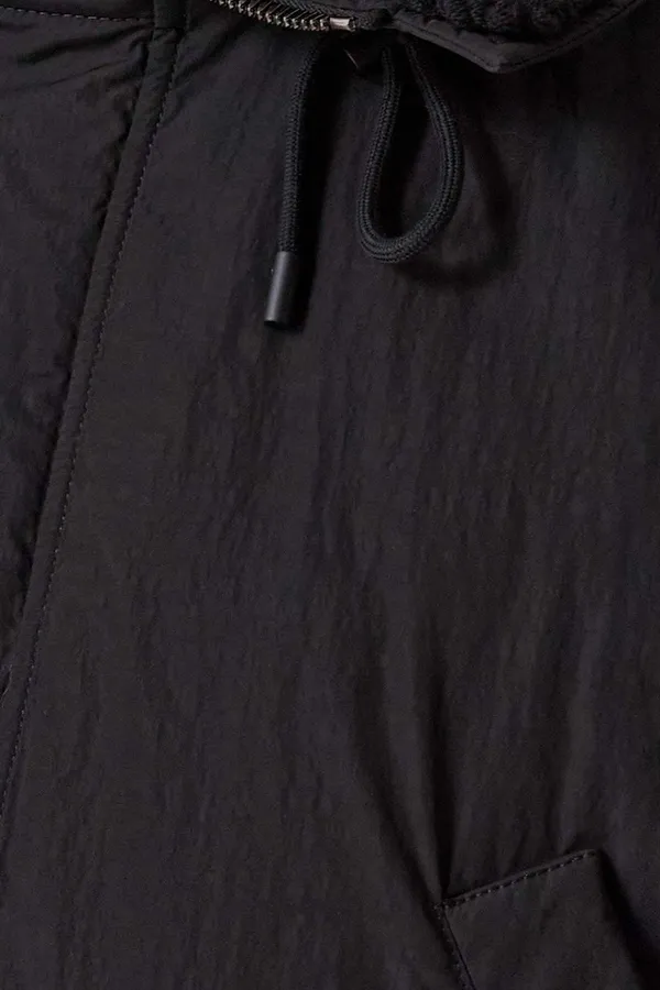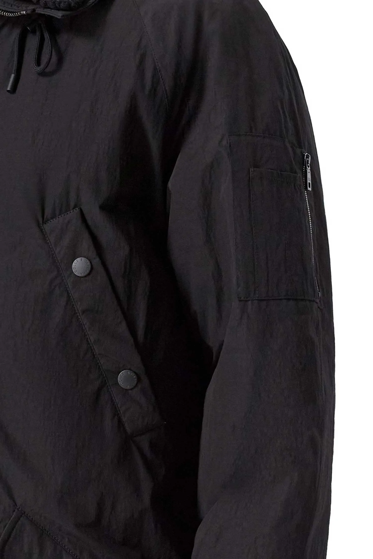 ПАРКА ЧЁРНАЯ, ТРИКОТАЖНЫЙ ВОРОТ, СНИЗУ КУЛИСКА, НА РУКАВЕ КАРМАН НА МОЛНИИ, КАПЮШОН
