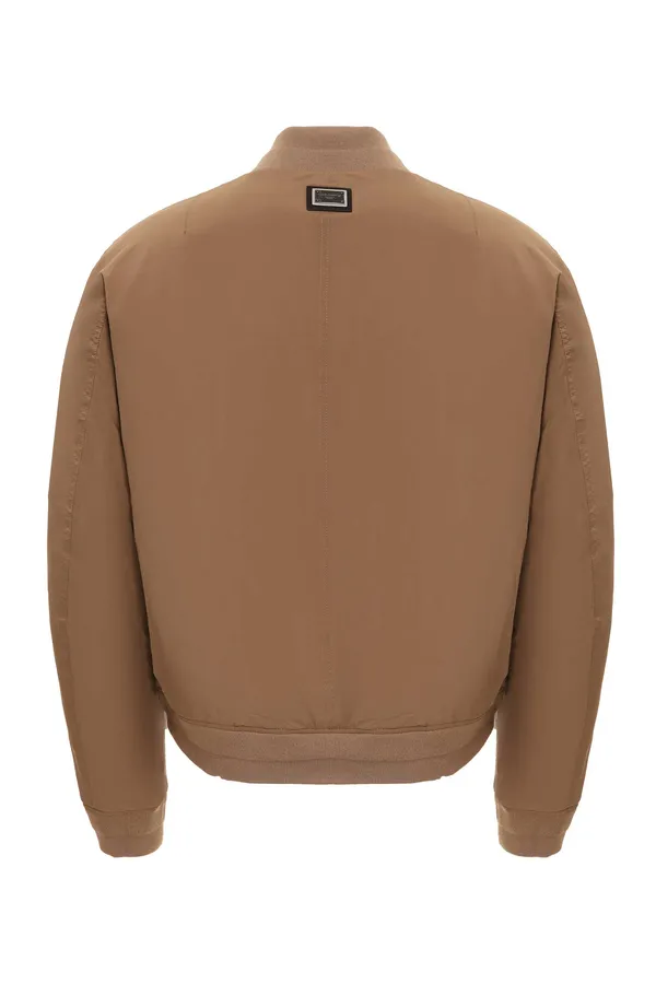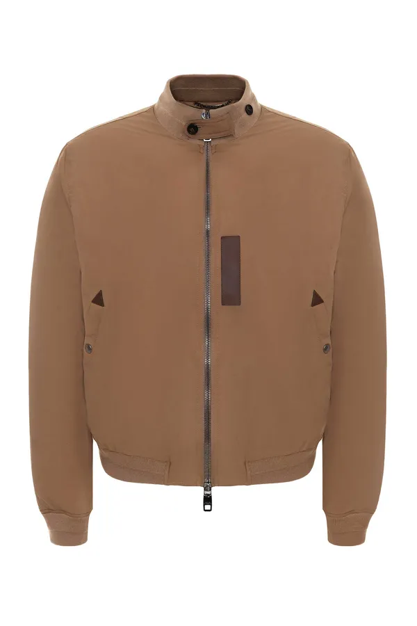 БОМБЕР-ПУХОВИК M.90 БЕЖЕВЫЙ, КОРИЧНЕВЫЙ КОЖАНЫЕ ВСТАВКИ, ТРИКОТАЖНЫЙ ВОРОТ-СТОЙКА С ПУГОВИЦЕЙ
