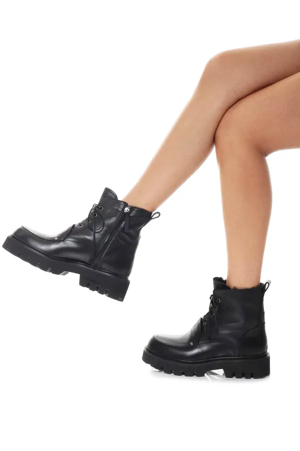 БОТИНКИ ЧЁРНЫЕ КОЖА, НА ШНУРКАХ, ДЕКОРАТ.ЯЗЫЧОК, МЕХ В ТОН, К=4,5