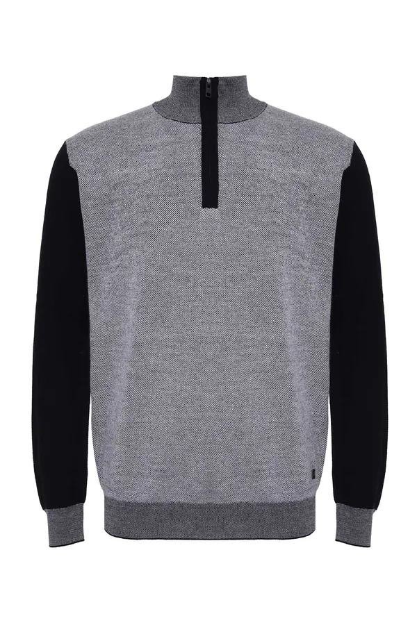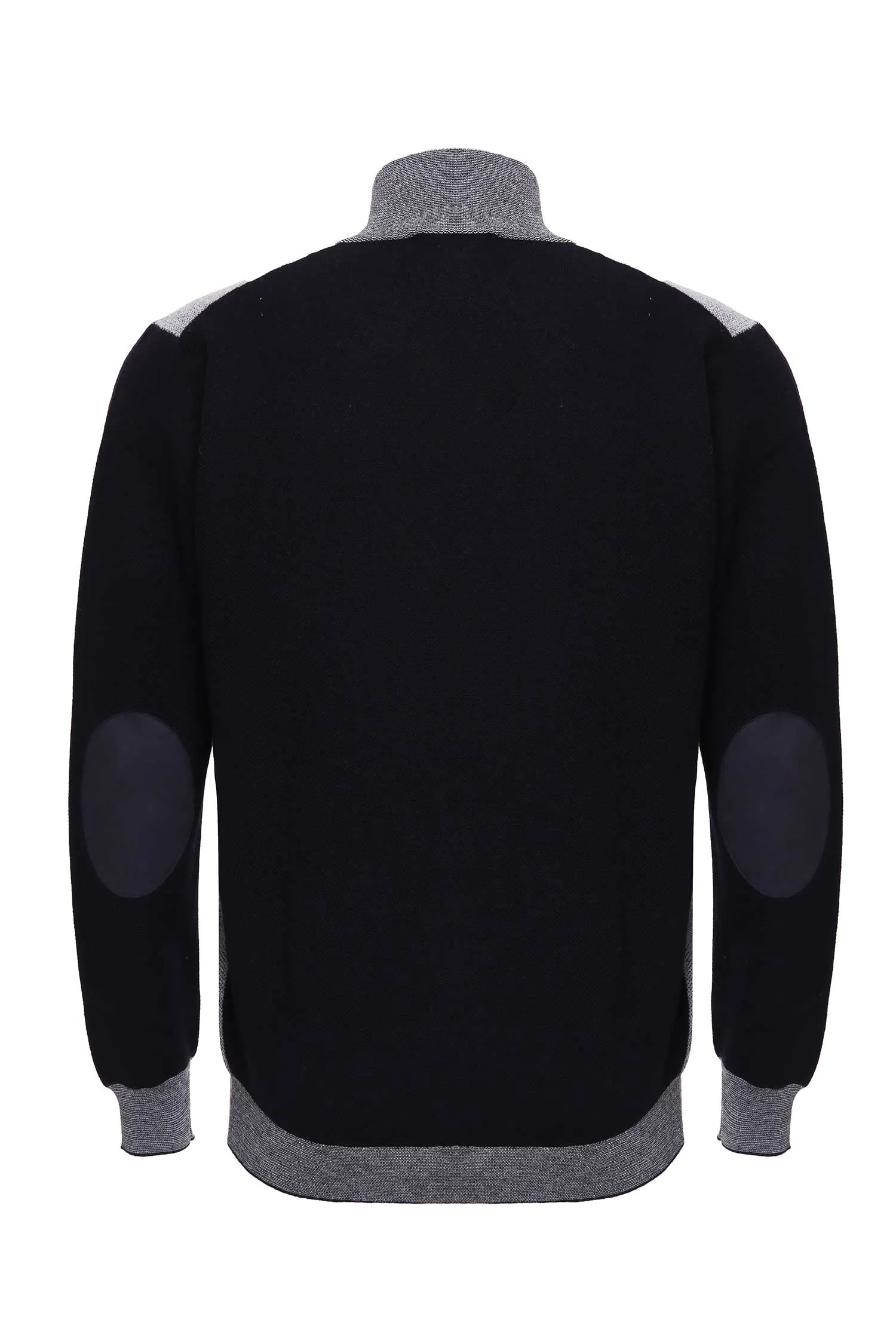 ДЖЕМПЕР Т/СИНЕ-СЕРЫЙ ШЕРСТЬ, ВОРОТ-СТОЙКА НА МОЛНИИ, НА РУКАВАХ ЗАПЛАТКИ