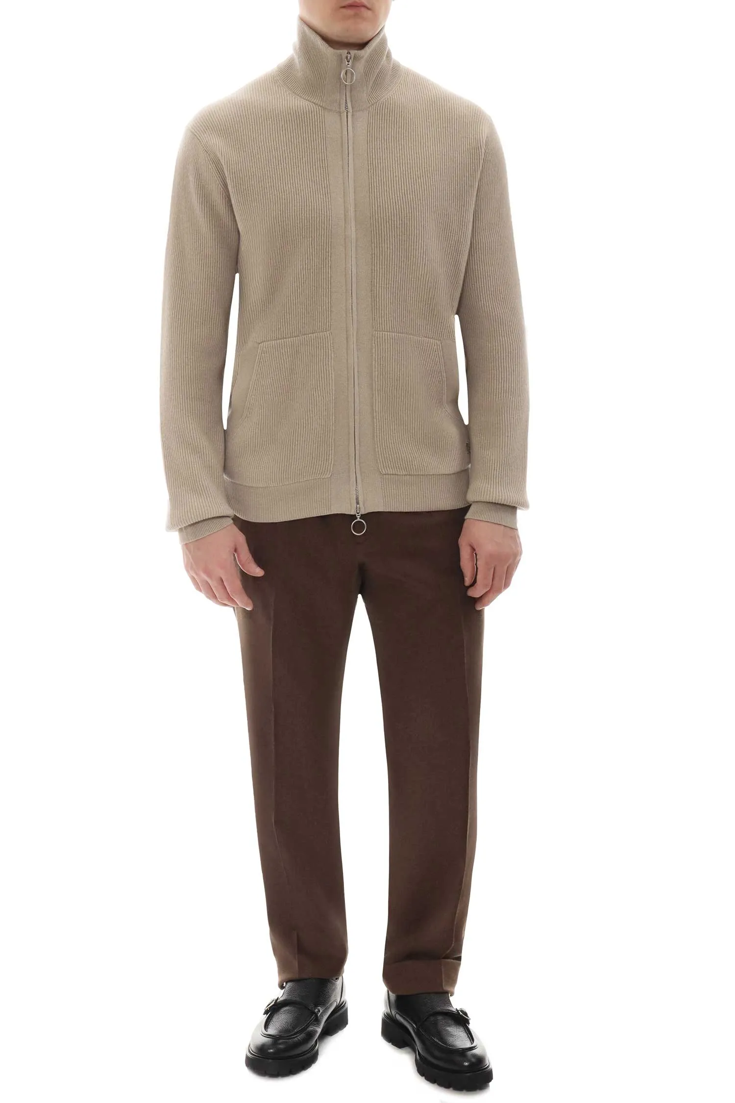 КАРДИГАН БЕЖЕВЫЙ ШЕРСТЬ/КАШЕМИР, НА МОЛНИИ, НАКЛАДНЫЕ КАРМАНЫ, ВОРОТ-СТОЙКА