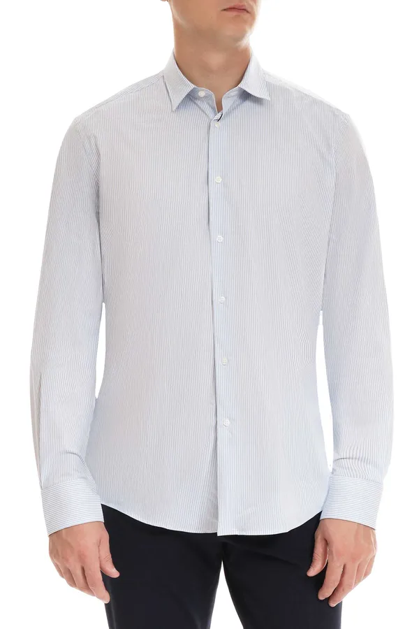 РУБАШКА БЕЛО-ГОЛУБАЯ В МЕЛКУЮ ПОЛОСКУ, ПРИТАЛЕННАЯ