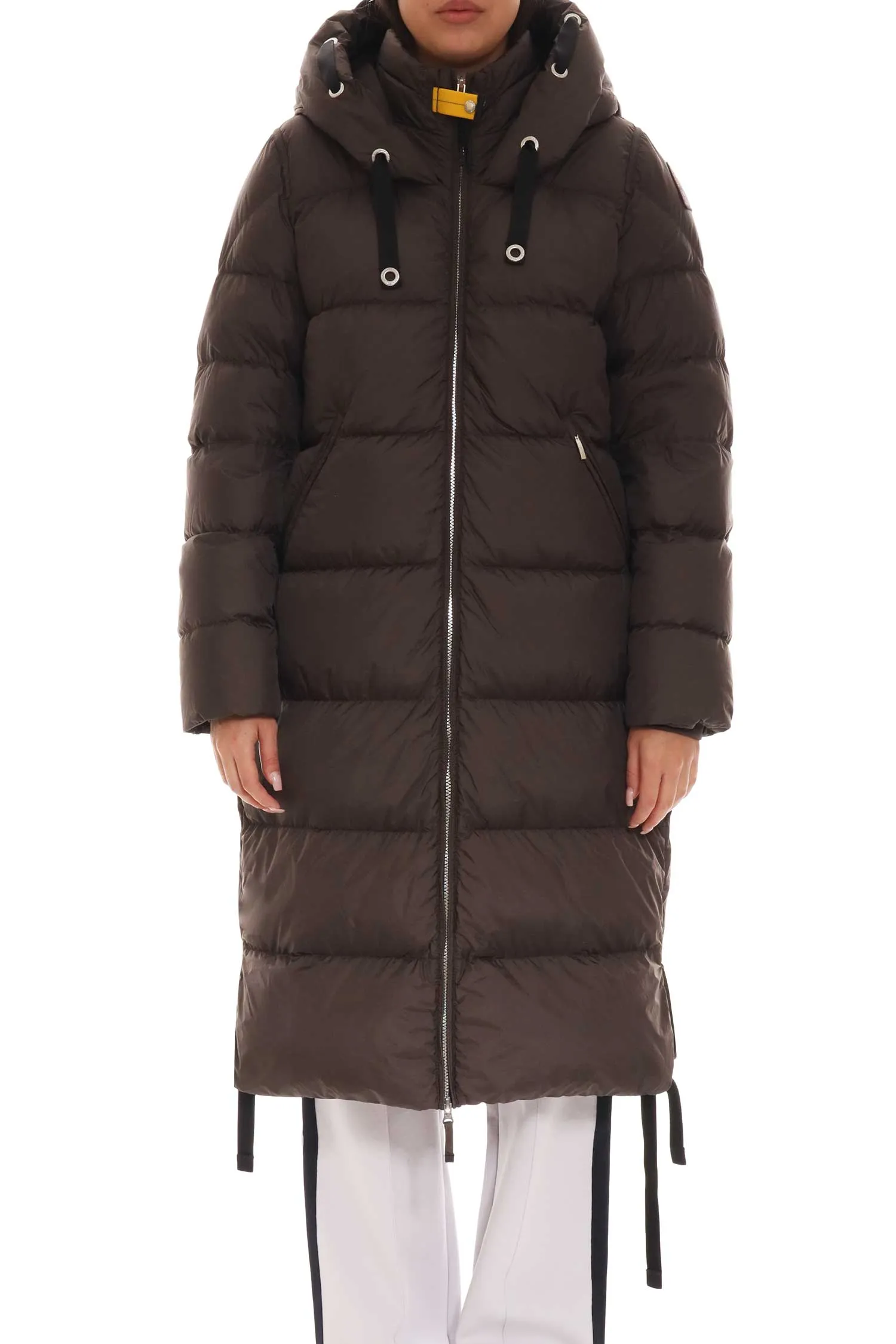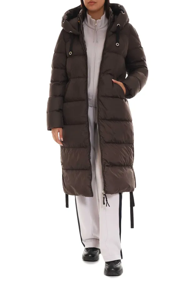 ПУХОВИК PANDA Т/КОРИЧНЕВЫЙ, СТЁГАНЫЙ, ДЛИННЫЙ, ТРИКОТАЖ.МАНЖЕТЫ, КАПЮШОН С ЧЁРНЫМИ ЗАВЯЗКАМИ, ВОРОТ-СТОЙКА