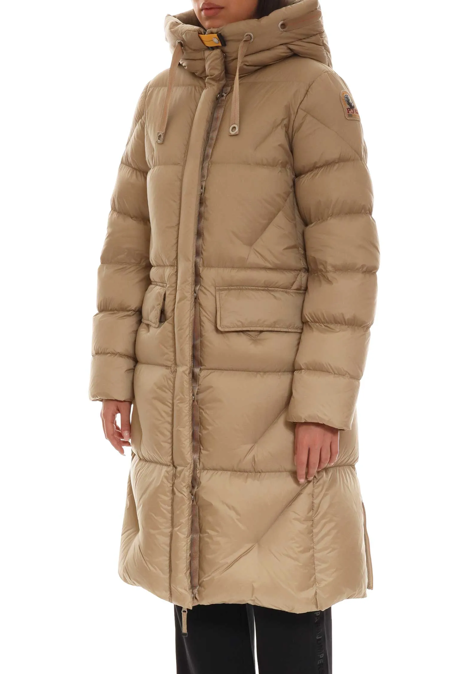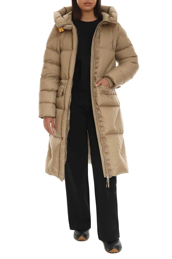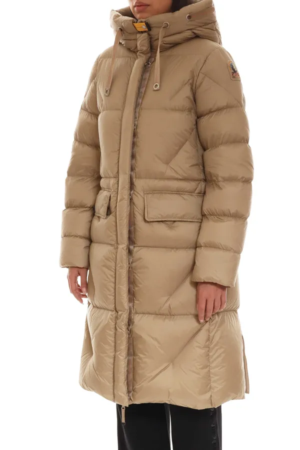 PARAJUMPERS ПУХОВИК LEONIE БЕЖЕВЫЙ, БЛЕСТЯЩИЙ, ДЛИННЫЙ, СЗАДИ МОЛНИИ, НАКЛАДНЫЕ КАРМАНЫ, КАПЮШОН