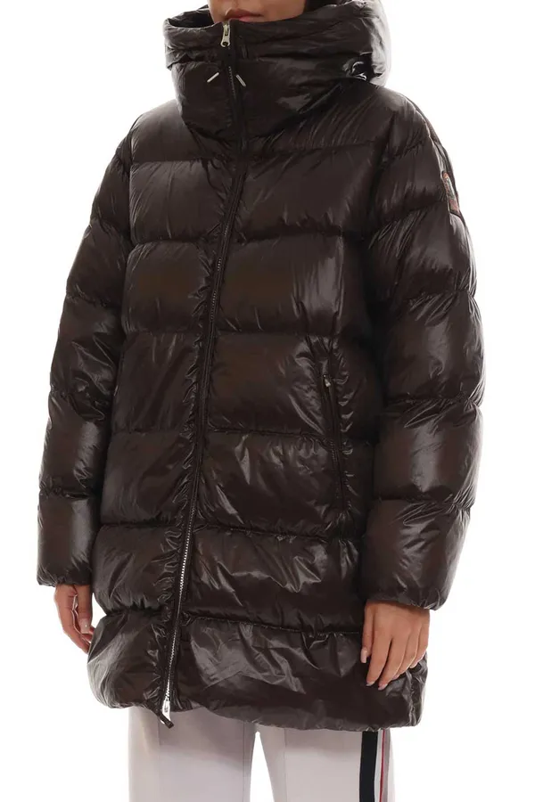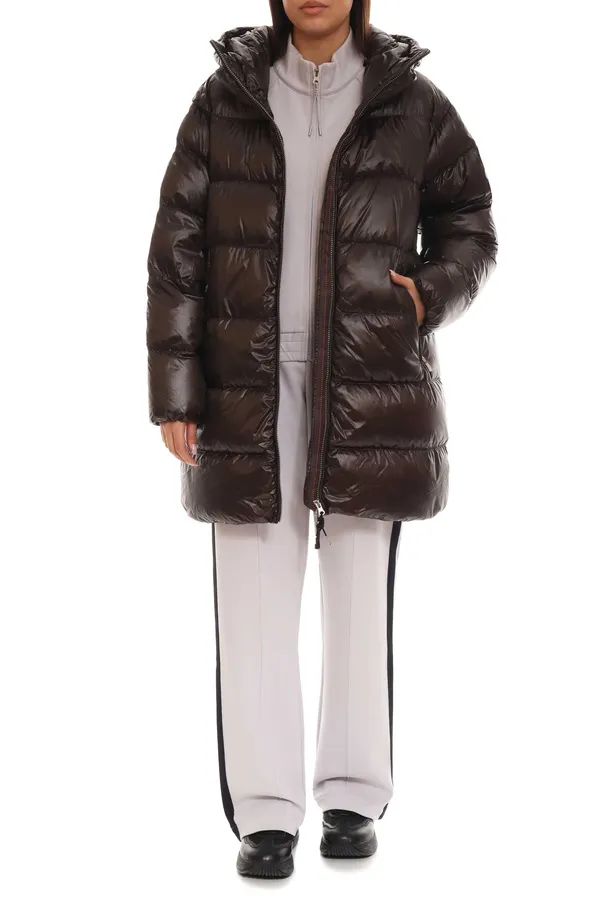 ПУХОВИК IVONNE Т/КОРИЧНЕВЫЙ, СТЁГАНЫЙ, УДЛИНЁННЫЙ, БЛЕСТЯЩИЙ, КАПЮШОН НА КУЛИСКЕ