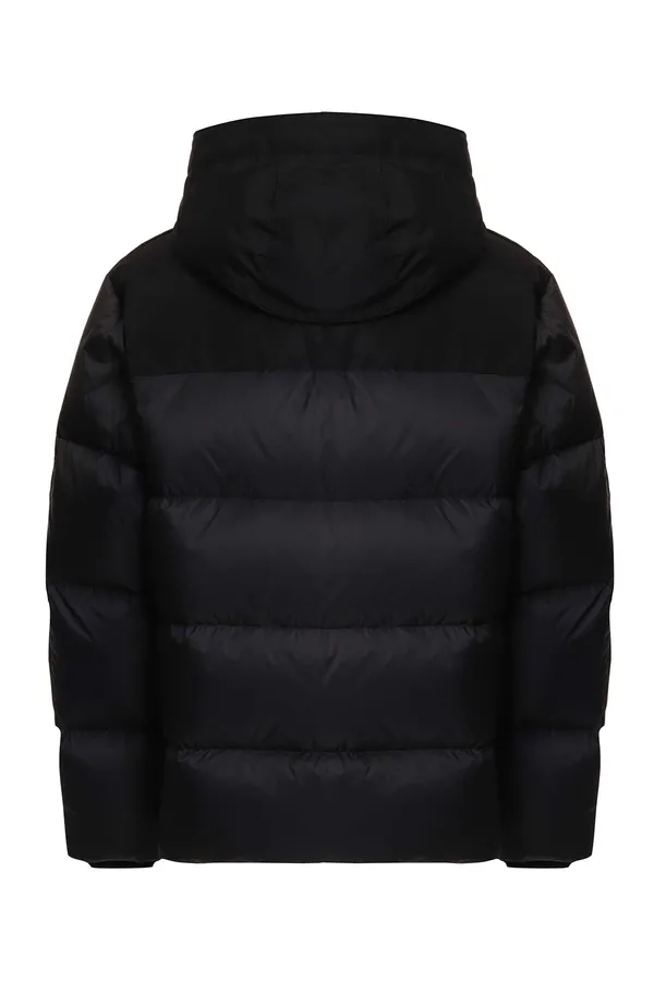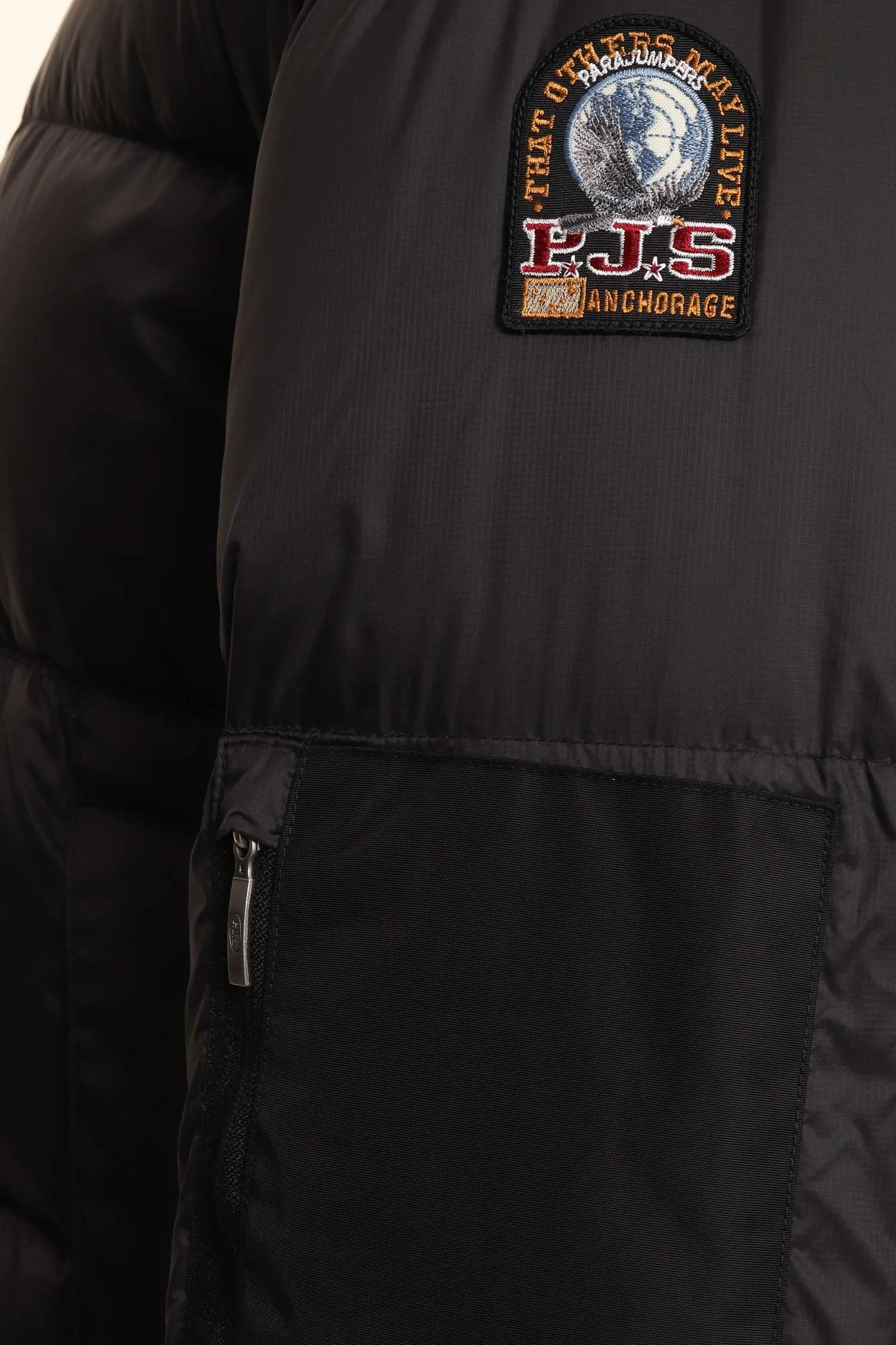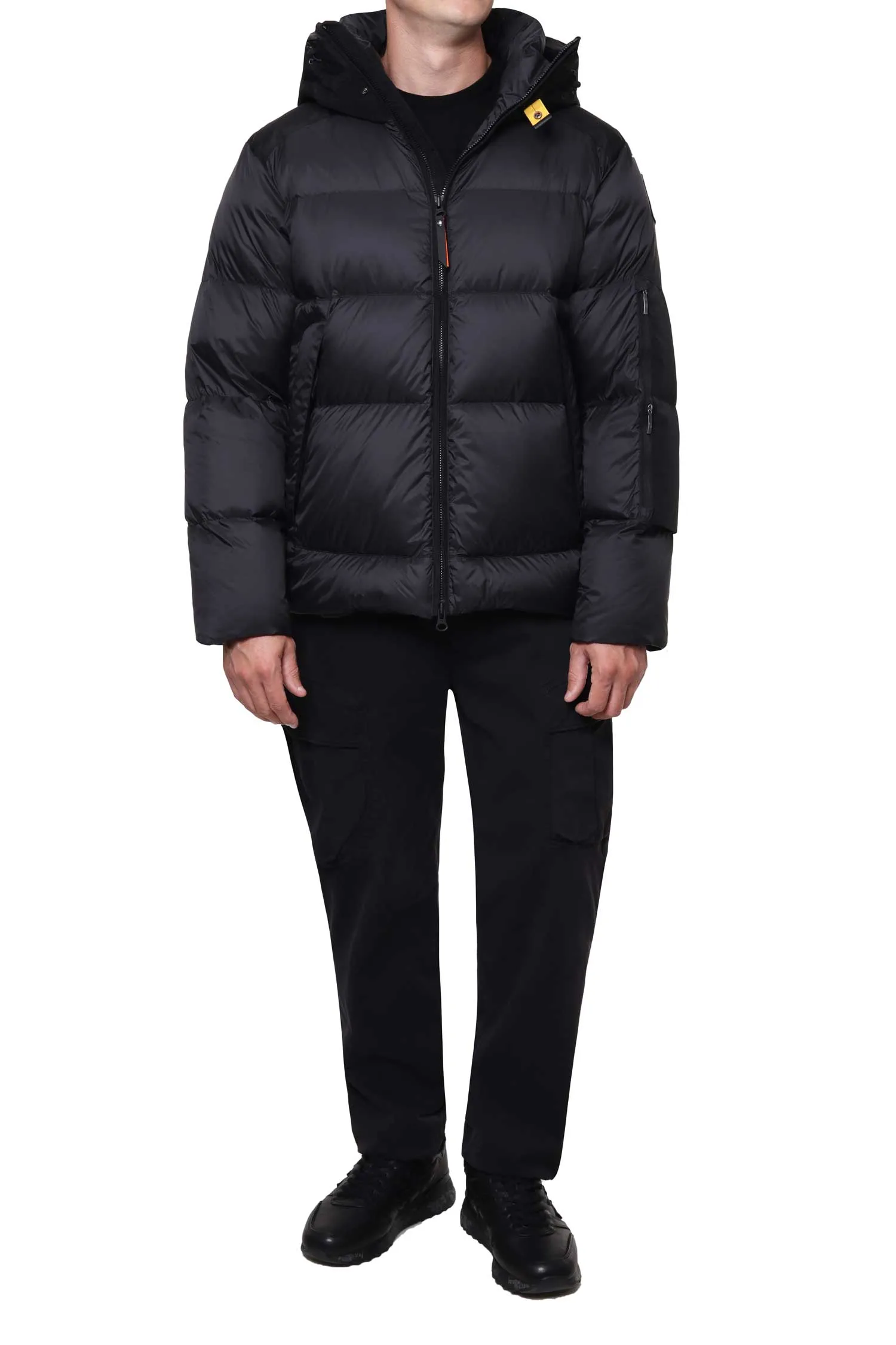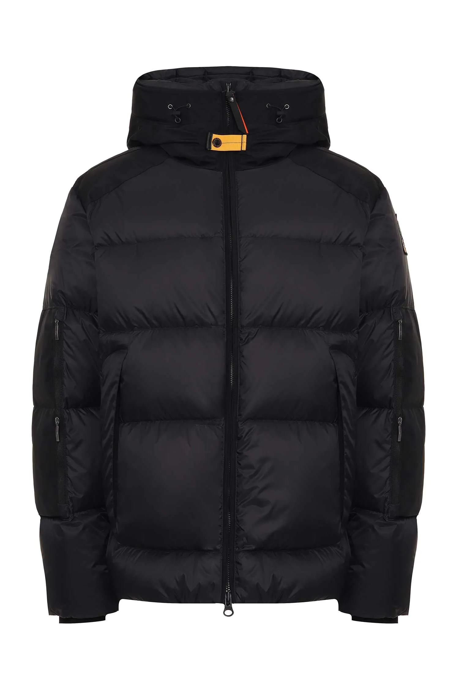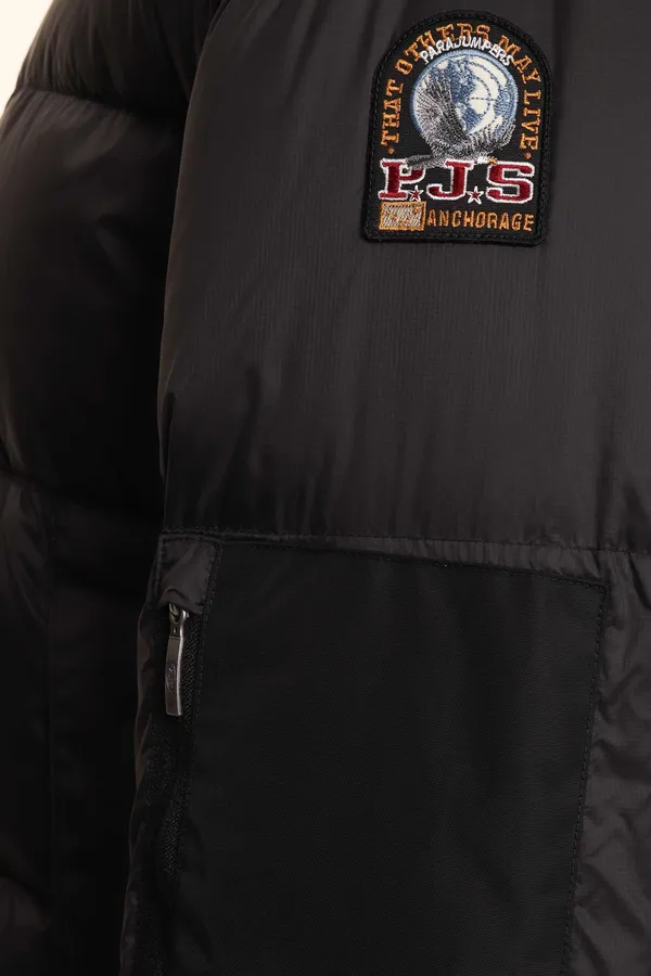 PARAJUMPERS ПУХОВИК TYRIK ЧЁРНЫЙ КОМБИНИР., НЕЙЛОН+ТЕКСТИЛЬ, КОРОТКИЙ, СНИЗУ НА КУЛИСКЕ, ВОРОТ-СТОЙКА, КАПЮШОН, WATER PROTECTION 10000