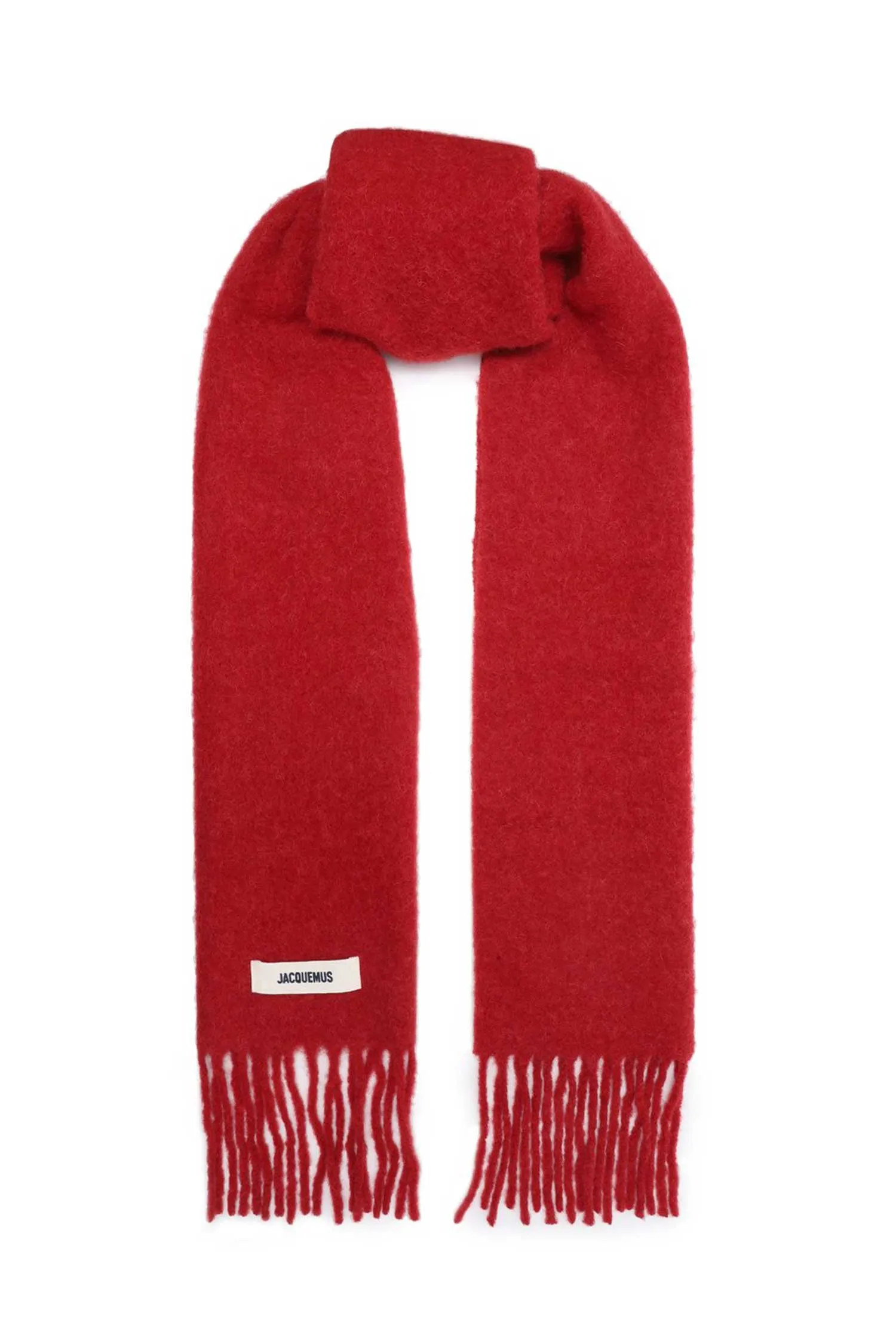 ШАРФ М.572 КРАСНЫЙ ШЕРСТЬ, МОЛОЧНАЯ НАШИВКА-ЛОГО, БАХРОМА