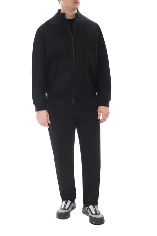 БОМБЕР ЧЁРНЫЙ ШЕРСТЬ/КАШЕМИР, НА РУКАВЕ НАШИВКА-ЛОГО В ТОН, КАРМАНЫ С КЛАПАНОМ, ТРИКОТАЖ.МАНЖЕТЫ