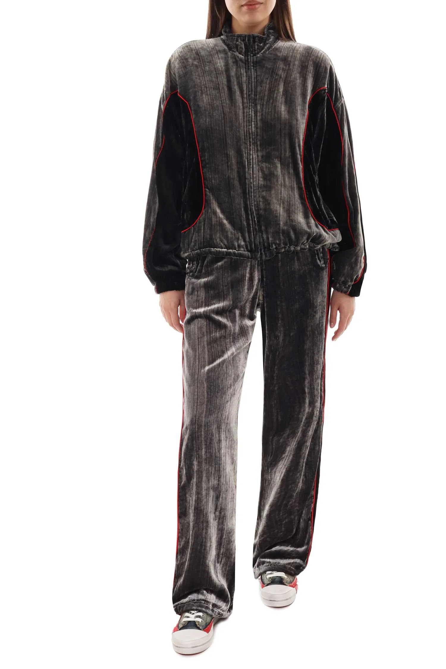 Костюм от Diesel в бархатном исполнении объединяет расслабленную спортивную эстетику и выразительный акцент бренда. Свободная олимпийка с воротником-стойкой и контрастными вставками дополнена вышивкой Oval D, а удобные штаны на кулиске имеют регулируемые манжеты и функциональные карманы. Мягкая фактура бархата с лёгким блеском придаёт образу динамику и утончённость. Универсальный комплект, который одинаково хорошо работает как в повседневных аутфитах, так и в ярких уличных сочетаниях.