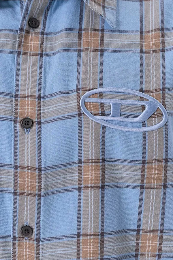 РУБАШКА БЕЖЕВО-ГОЛУБАЯ В КЛЕТКУ, ФЛАНЕЛЬ, НА ГРУДИ ВЫШИТОЕ ГОЛУБОЕ ЛОГО