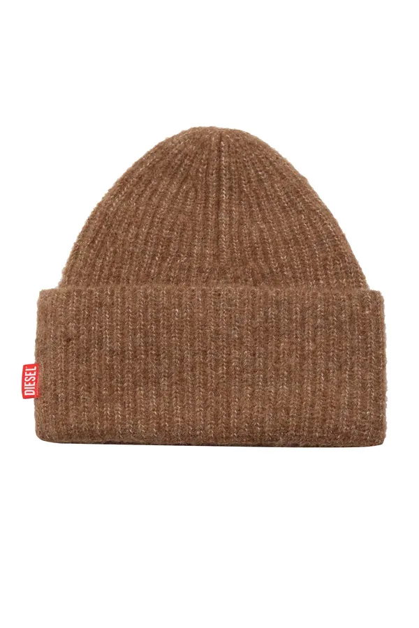 ШАПКА КОРИЧНЕВАЯ МЕЛАНЖ, ШЕРСТЬ, С ОТВОРОТОМ, МАЛЕНЬКАЯ КРАСНАЯ НАШИВКА-ЛОГО