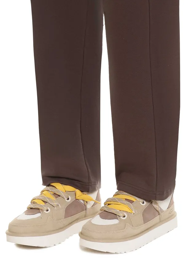 UGG КЕДЫ LO LOWMEL БЕЛО-БЕЖЕВО-КОРИЧНЕВЫЕ, КОМБИНИР., ТЕКСТИЛЬ+ЗАМША, ДВОЙНАЯ ШНУРОВКА, ЖЁЛТЫЕ/БЕЖЕВЫЕ ШНУРКИ, К=2,5