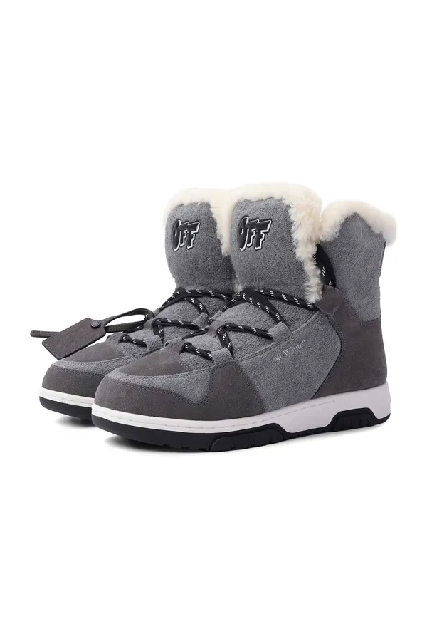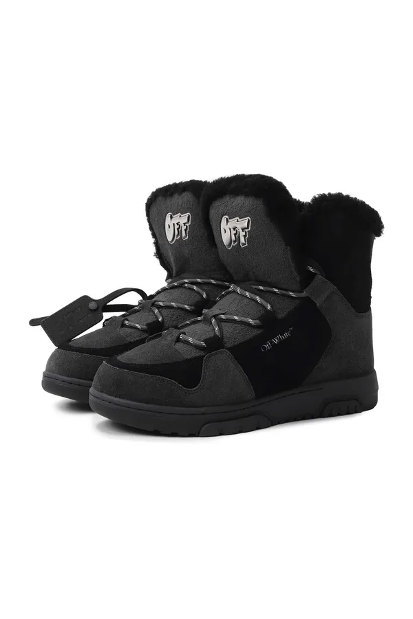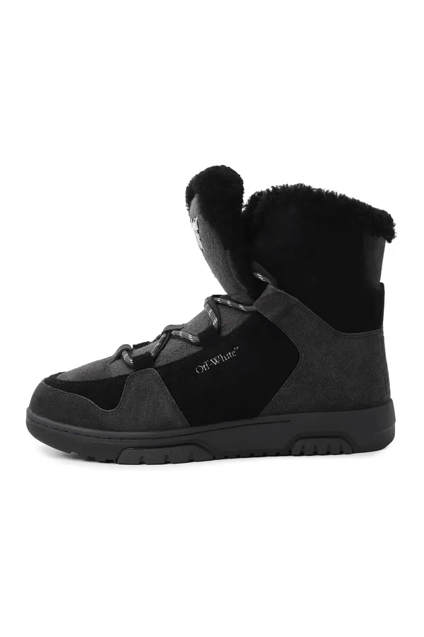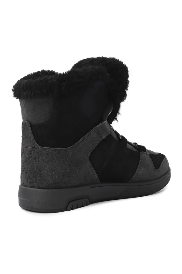 OFF-WHITE КЕДЫ WINTER BOOT ЧЁРНО-СЕРЫЕ ЗАМША, ВЫСОКИЕ, ЧЁРНЫЙ МЕХ, НА ЯЗЫЧКЕ ЛОГО, ДВОЙНЫЕ ШНУРКИ, СЕРЫЙ БРЕЛОК, К=3,5