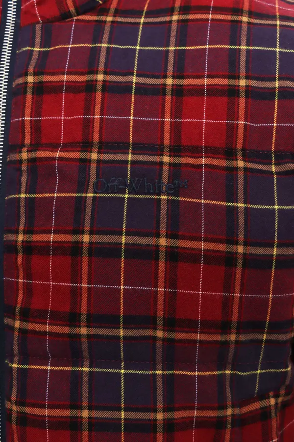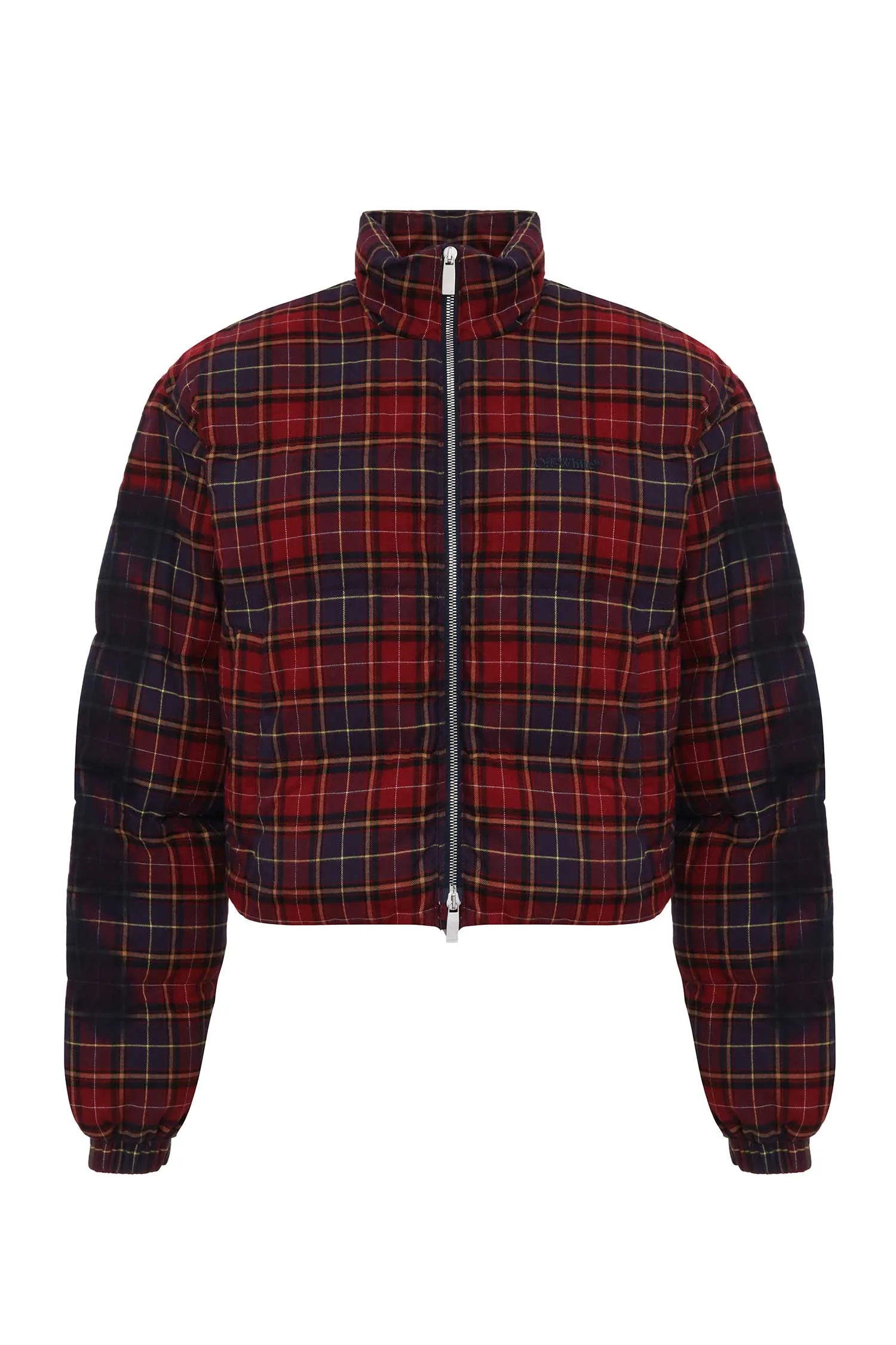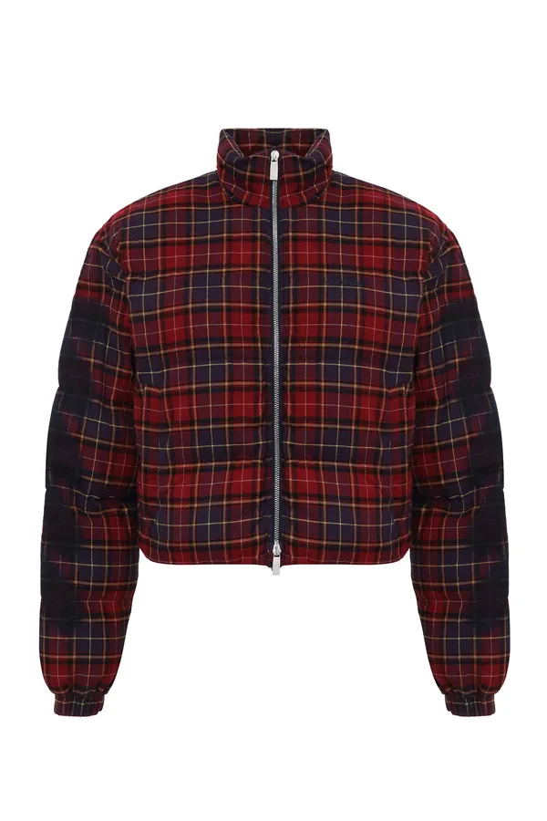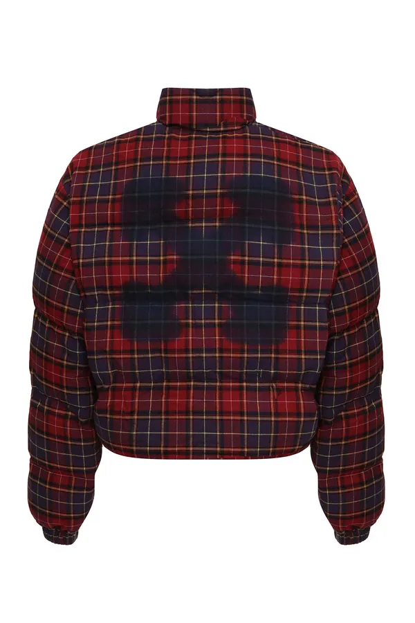 ПУХОВИК БОРДОВО-ФИОЛЕТОВО-ЖЁЛТЫЙ В КЛЕТКУ, С СИНТЕТ.НАПОЛН., УКОРОЧЕННЫЙ, СНИЗУ НА КУЛИСКЕ, ВОРОТ-СТОЙКА