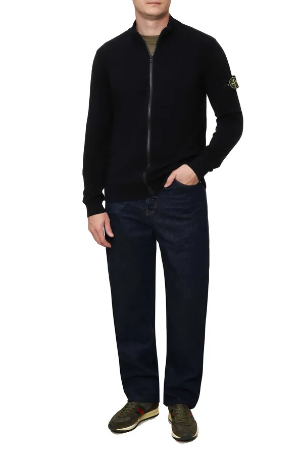 КАРДИГАН ЧЁРНЫЙ ШЕРСТЬ, НА МОЛНИИ, НА РУКАВЕ СЪЁМНАЯ НАШИВКА-ЛОГО, ВОРОТ-СТОЙКА