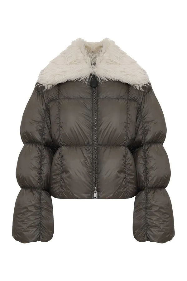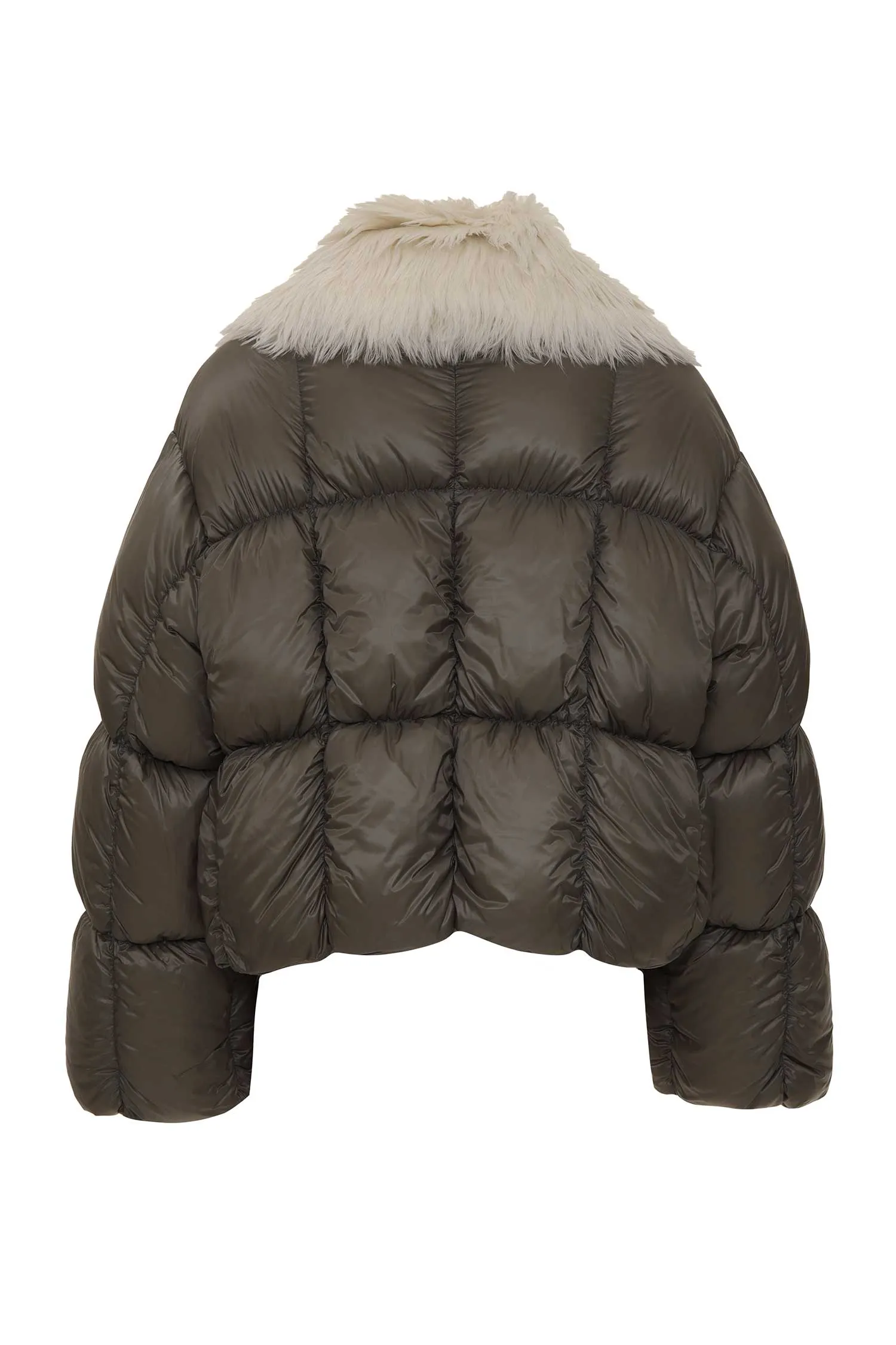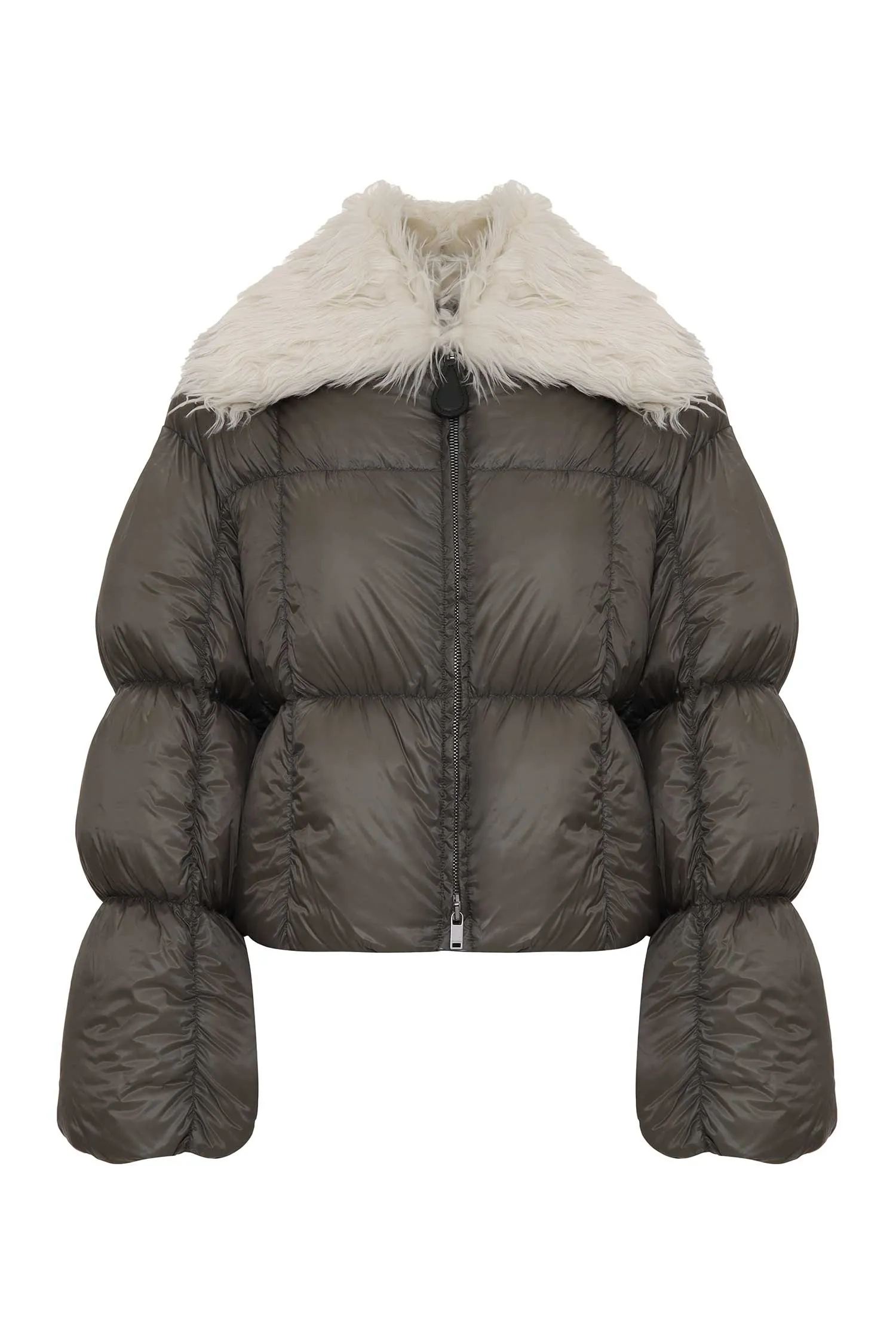 ПУХОВИК M.0130 ОЛИВКОВЫЙ, УКОРОЧЕННЫЙ, СТЁГАНЫЙ, СНИЗУ НА КУЛИСКЕ, ОТСТЁГИВ.ВОРОТНИК ИЗ МОЛОЧНОЙ ШЕРСТИ АЛЬПАКИ, ВОРОТ-СТОЙКА