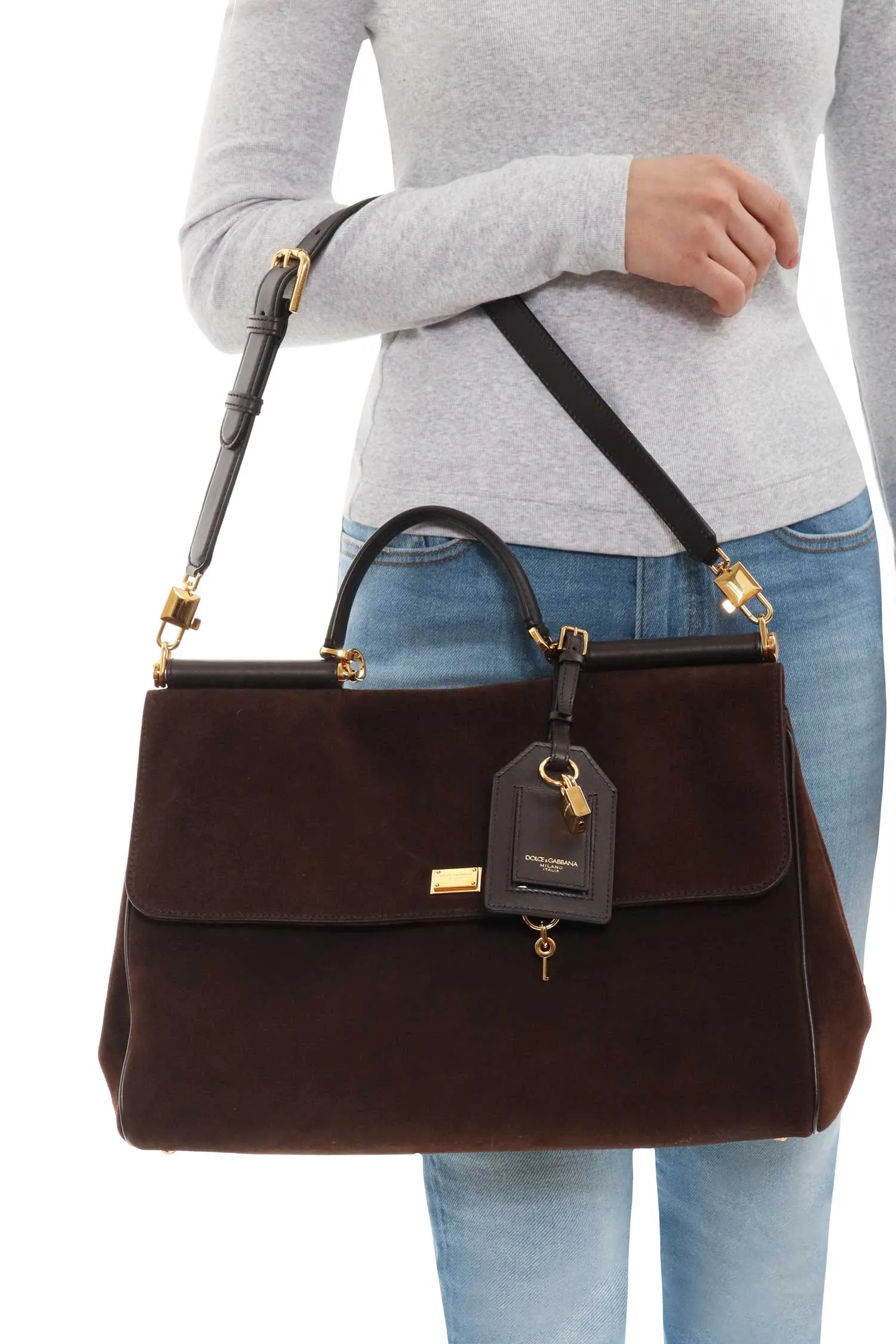СУМКА MY SICILY LARGE КОРИЧНЕВАЯ ЗАМША, БРЕЛОК-ЗАМОК, ЛОГО НА КЛАПАНЕ