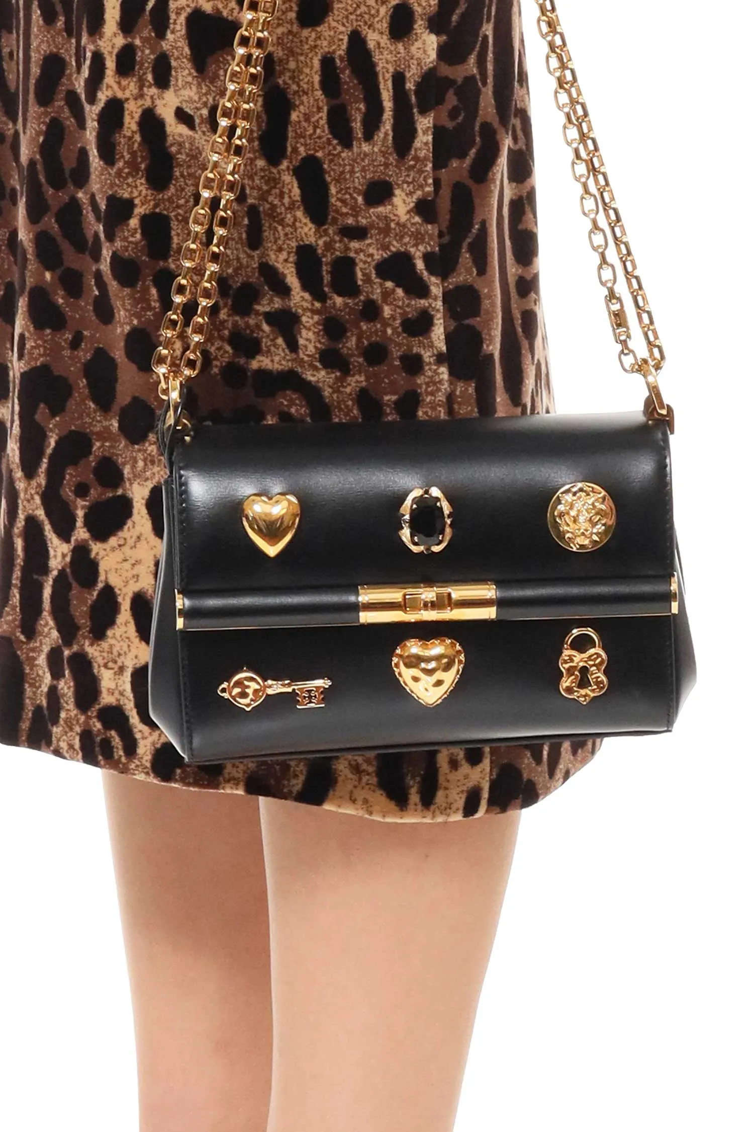 Сумка Marlene от Dolce&Gabbana — компактная модель на цепочном ремне, выполненная из фактурной телячьей кожи. Клапан с фирменной поворотной застёжкой и рельефные металлические медальоны добавляют выразительности и подчёркивают ювелирный характер аксессуара. Внутри — кожаная отделка и плоский карман, достаточный объём для ключей, телефона и необходимых мелочей. Изысканная деталь для повседневных и вечерних образов.