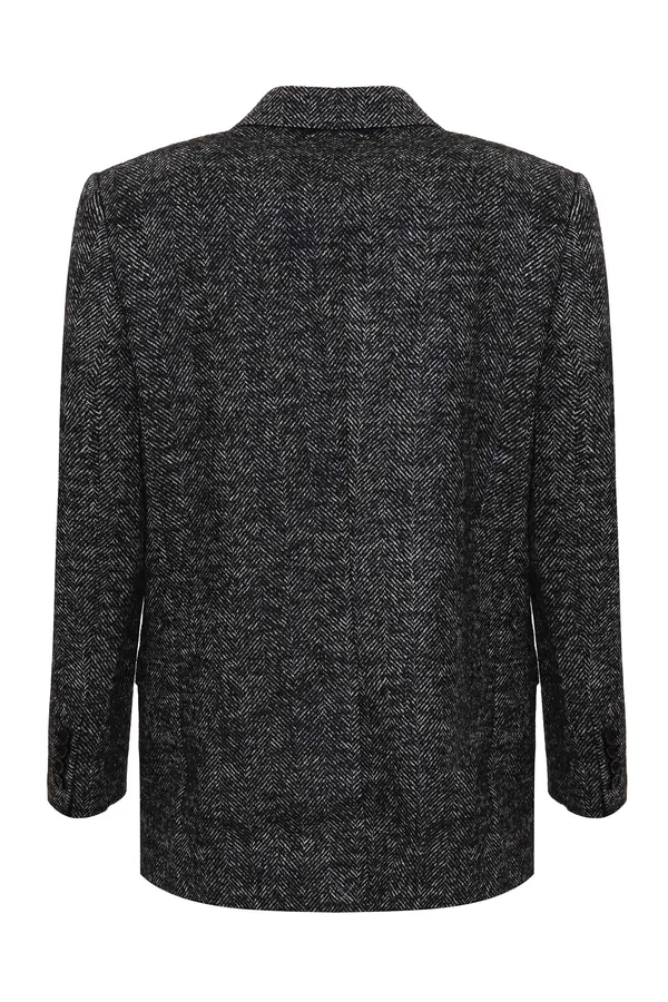 Двубортный жакет из плотной шерстяной ткани с выразительной фактурой создаёт структурный силуэт и подчёркивает архитектурность линии плеч. Классическая конструкция с острыми лацканами, шлицей на рукавах и идеальной посадкой делает модель универсальной для повседневных и формальных образов. Внутренняя часть полностью на подкладке, обеспечивающей комфорт и аккуратное облегание. Выполнен в Италии из шерсти с добавлением современных волокон для прочности и формы.