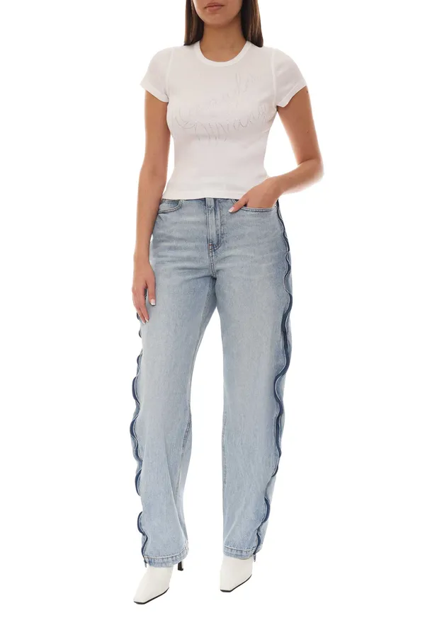 ДЖИНСЫ ГОЛУБЫЕ ВЫБЕЛЕННЫЕ, ШИРОКИЕ, СБОКУ Т/СИНИЕ МОЛНИИ, Ш=23