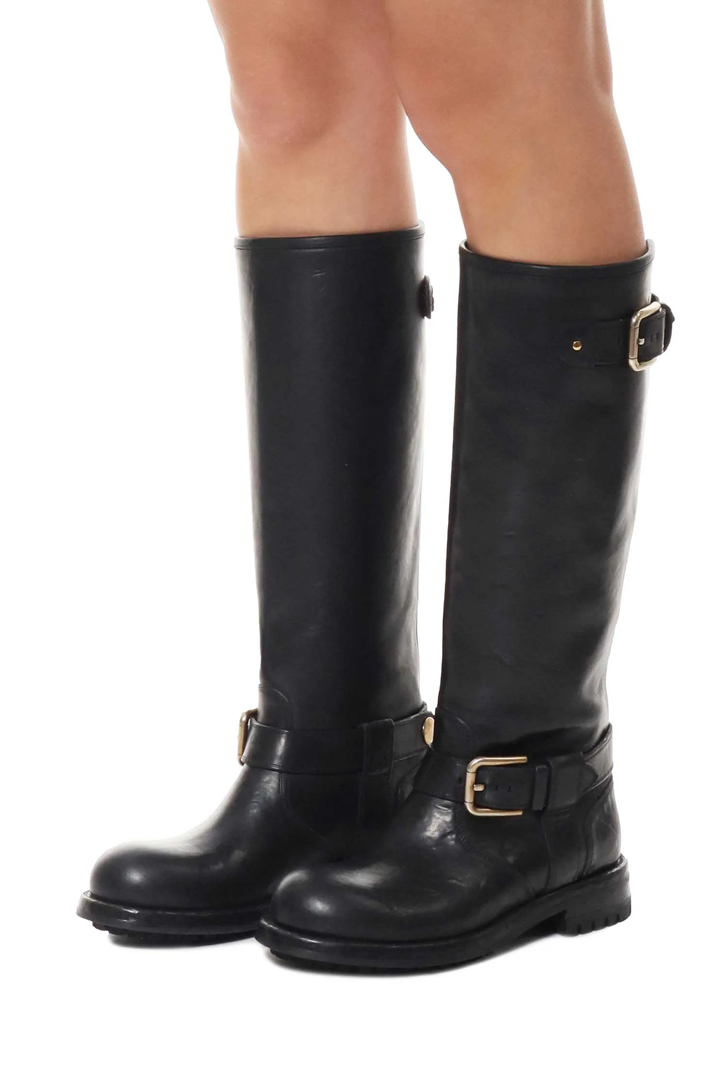 Сапоги Bernini 20 созданы из плотной телячьей кожи и выполнены в характерной байкерской стилистике с акцентом на выверенную конструкцию и удобную посадку. Ремешки с металлическими пряжками подчёркивают графичность модели, а застёжка сзади делает посадку более удобной. Кожаная подошва дополнена прочным протектором из современного материала, что даёт устойчивость при ходьбе. Внутренняя стелька полностью кожаная. Сделано в Италии.