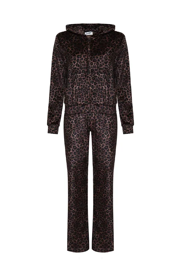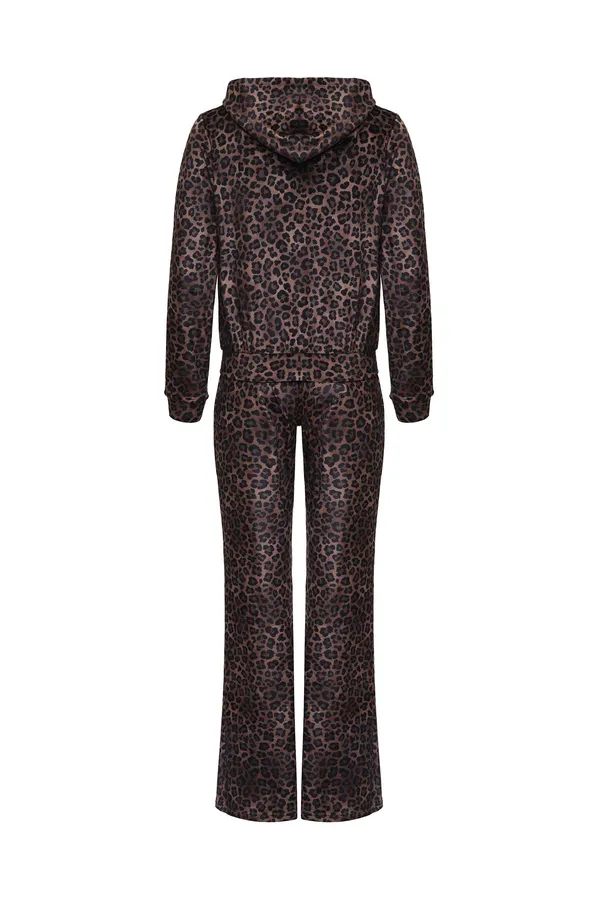 КОСТЮМ DAIANA CHENILLE+CECILIA CHENILLE КОРИЧНЕВО-БЕЖЕВЫЙ ВЕЛЮР, ПРИНТ ЛЕОПАРД, ОЛИМПИЙКА+ШТАНЫ СВОБОДНЫЕ, КАПЮШОН