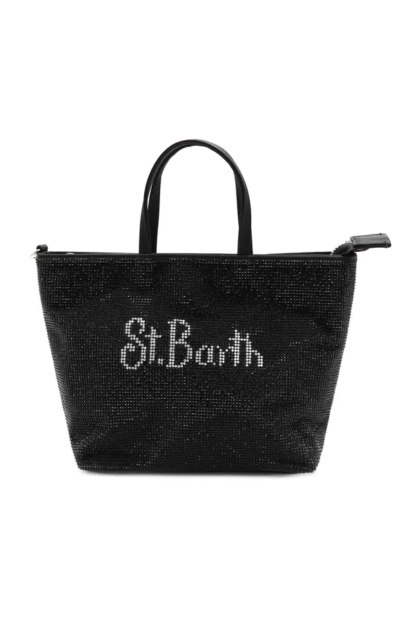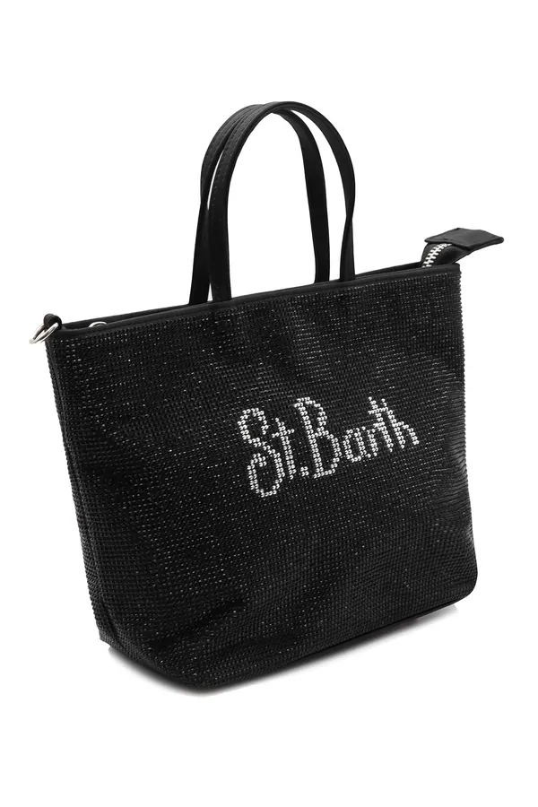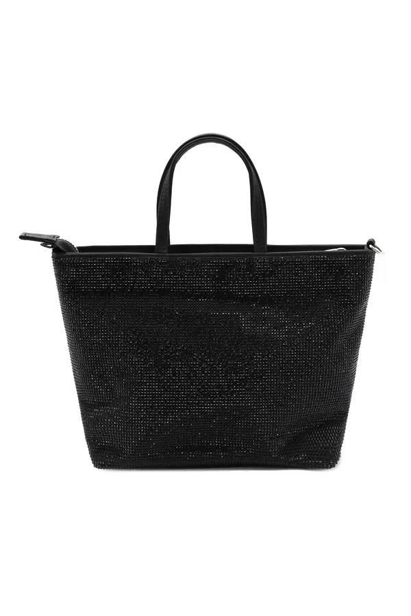 СУМКА STRASS MINI BAG ЧЁРНАЯ В СТРАЗАХ, НА МОЛНИИ, СЕРЕБРИСТАЯ ЛОГО-НАДПИСЬ, РУЧКИ, АТЛАСНЫЙ РЕМЕШОК