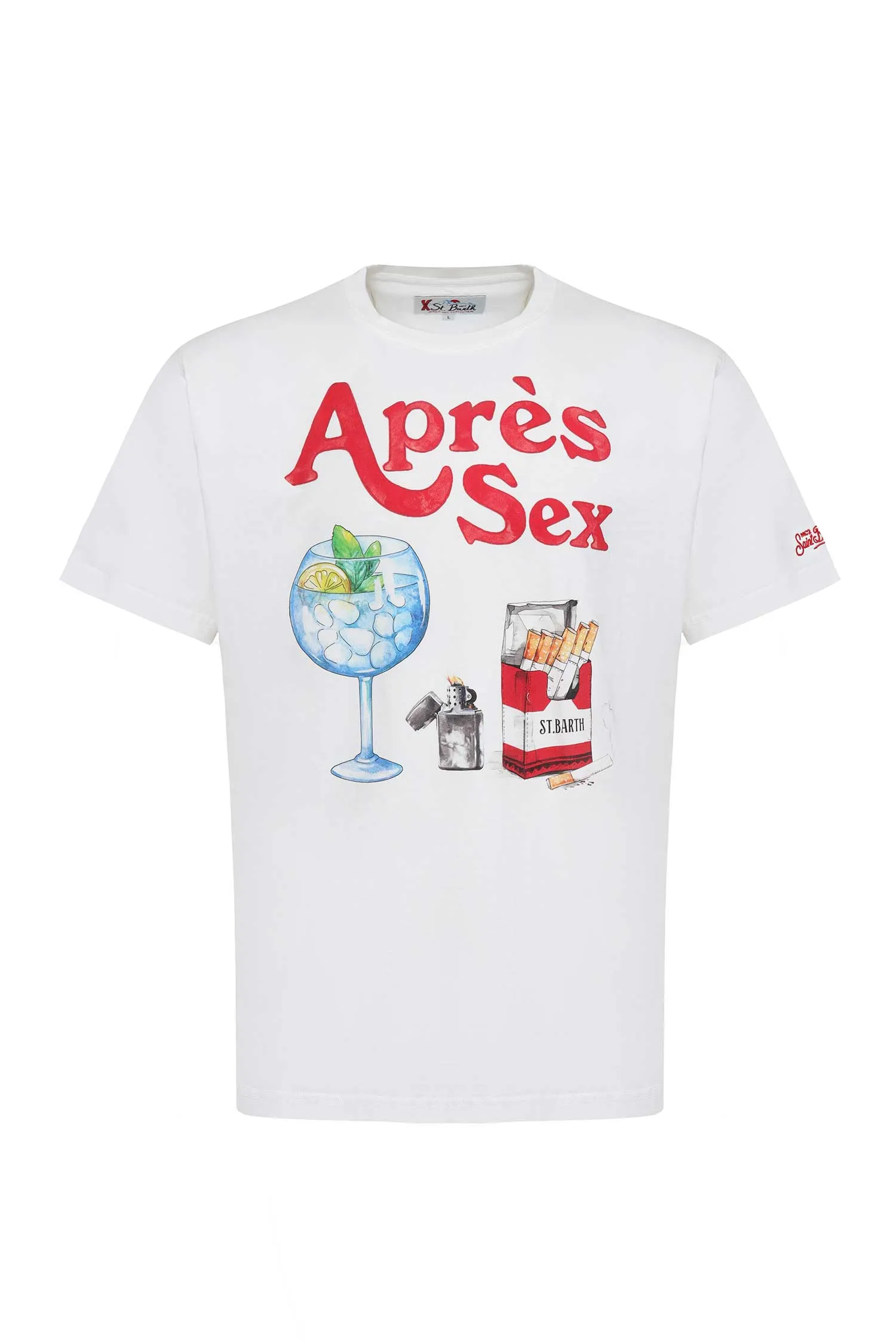 ФУТБОЛКА ARNOTT БЕЛАЯ, НА ГРУДИ РИС.КОКТЕЙЛЬ И СИГАРЕТЫ, НАДПИСЬ APRES SEX