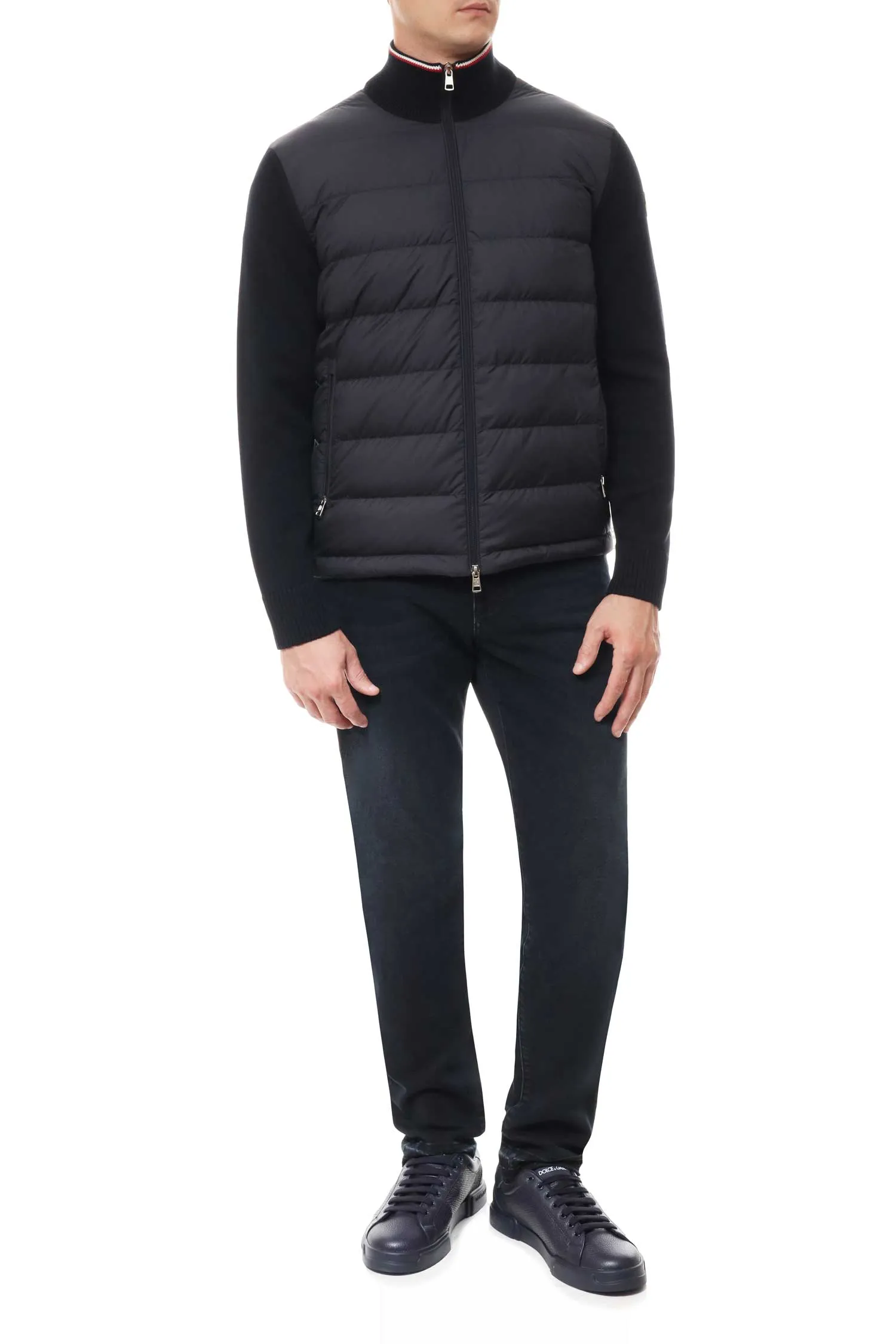 Куртка-пуховик Moncler сочетает вязаную основу из хлопка и стёганую переднюю часть с утеплителем из пуха и пера. Лёгкая и функциональная, она подходит как для носки в прохладную погоду, так и в качестве промежуточного слоя. Модель дополнена воротником-стойкой, карманами на молнии и фирменной нашивкой на рукаве.
