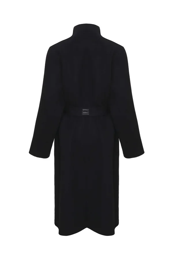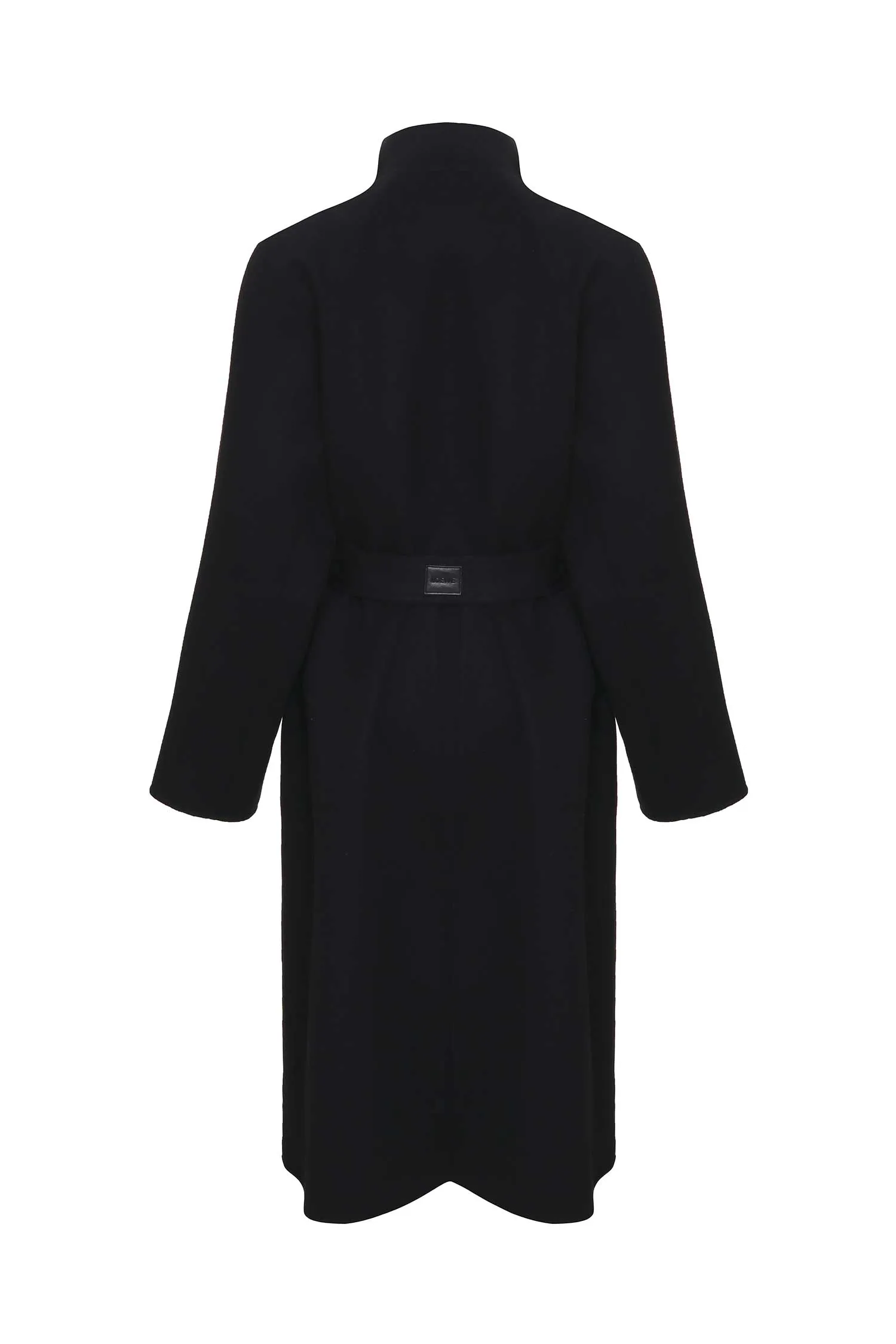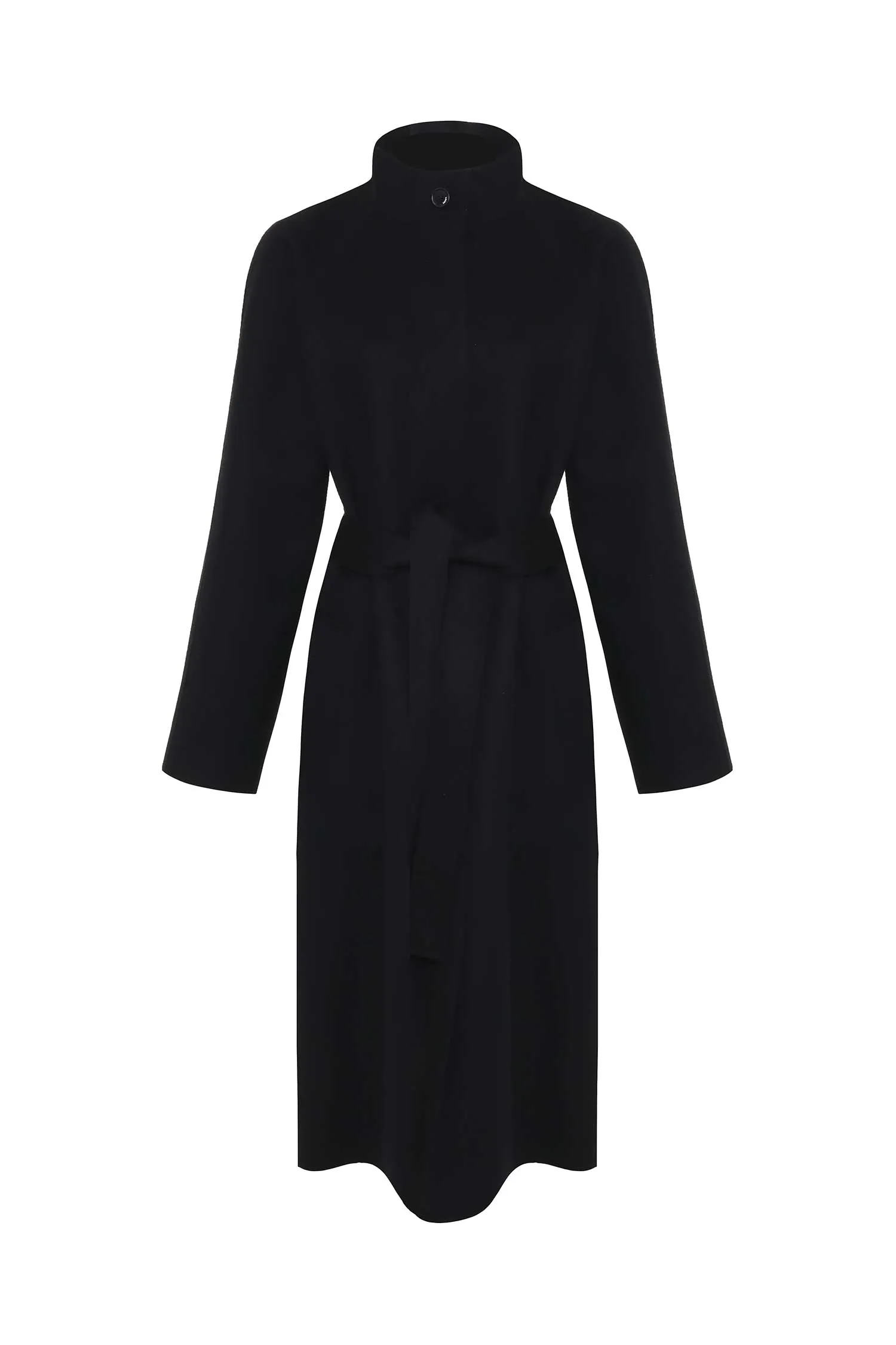 ПАЛЬТО ЧЁРНОЕ ШЕРСТЬ/КАШЕМИР, ДЛИННОЕ, БЕЗ ПОДКЛАДКИ, НА ПУГОВИЦАХ, РУКАВА-РЕГЛАН, ПОЯС, ВОРОТ-СТОЙКА