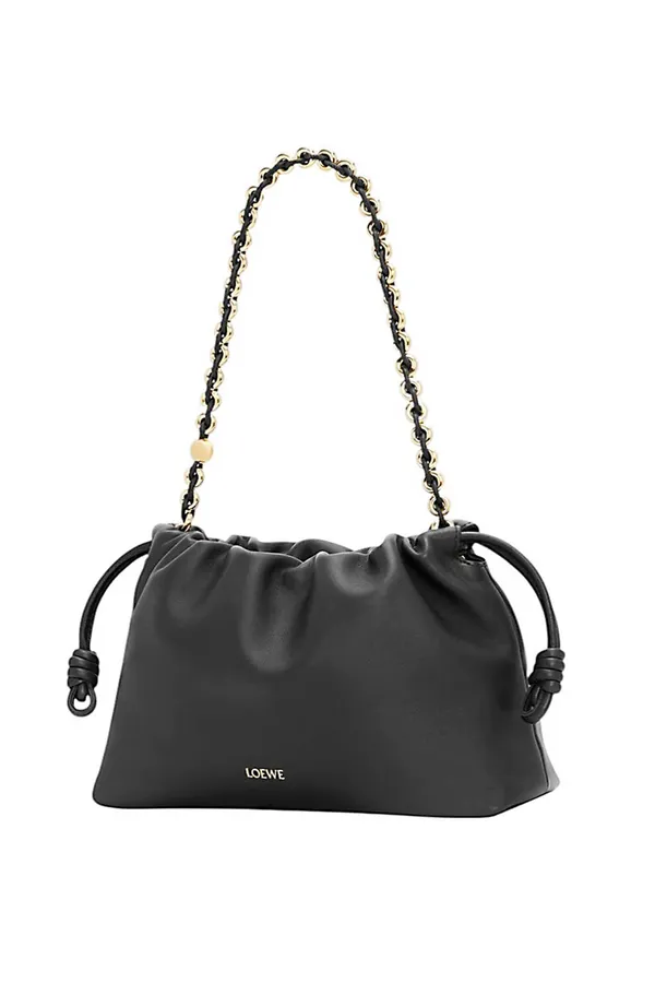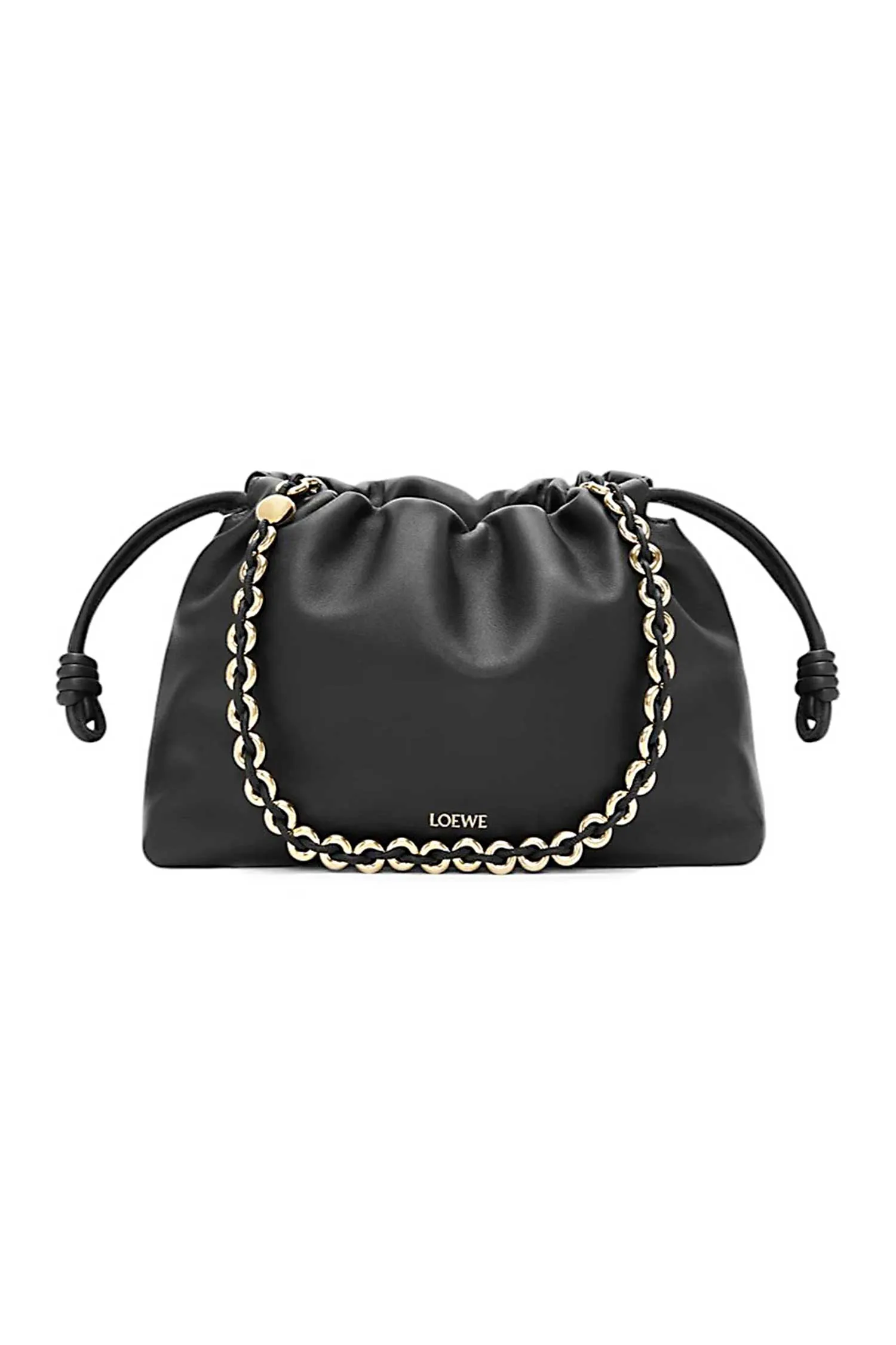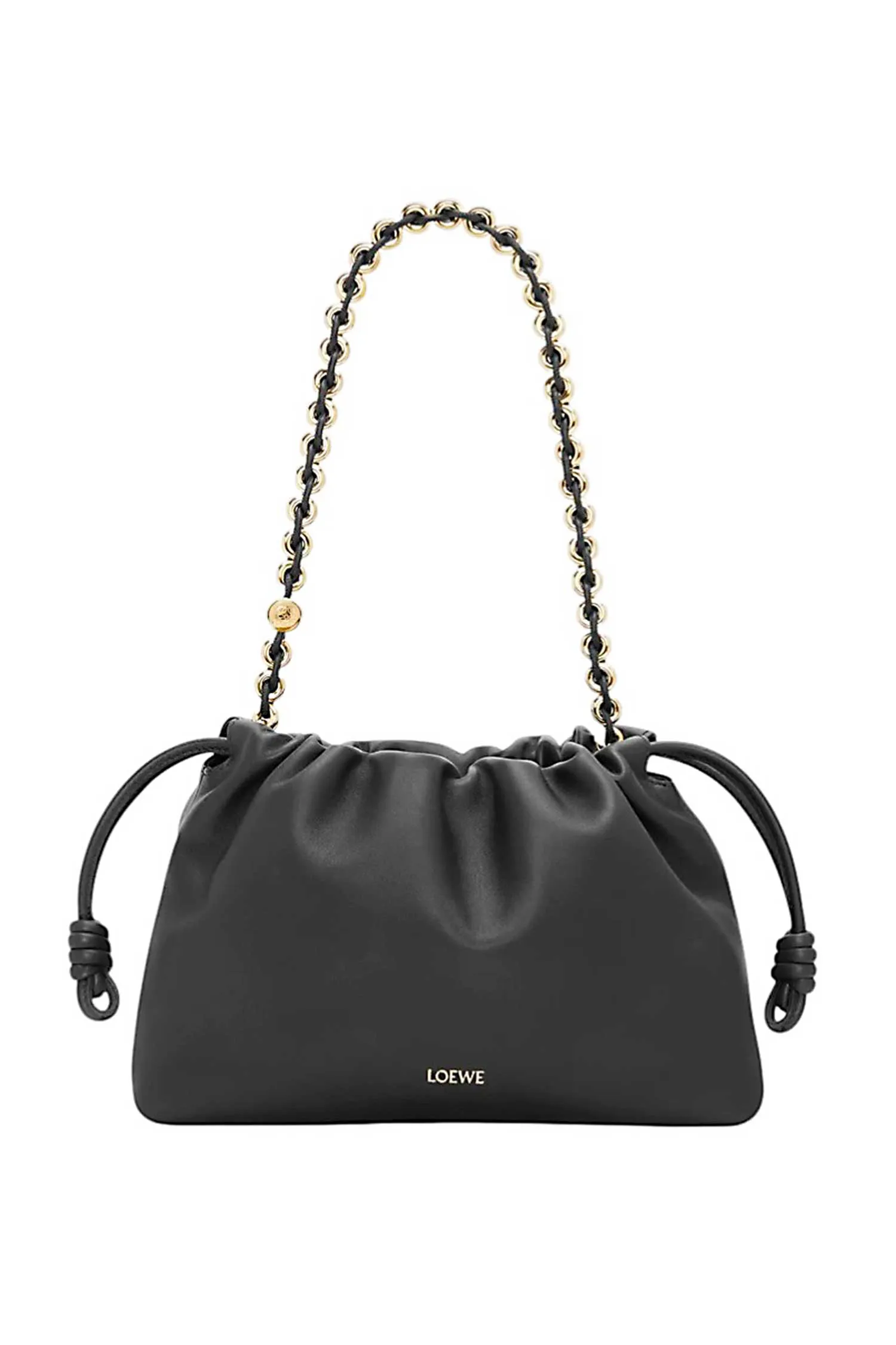 СУМКА FLAMENCO MEDIUM ЧЁРНАЯ, КОЖАНАЯ, НА КУЛИСКЕ, МАГНИТНАЯ ЗАСТЁЖКА, ЗОЛОТИСТАЯ ЦЕПОЧКА, РЕМЕШОК-ШНУР