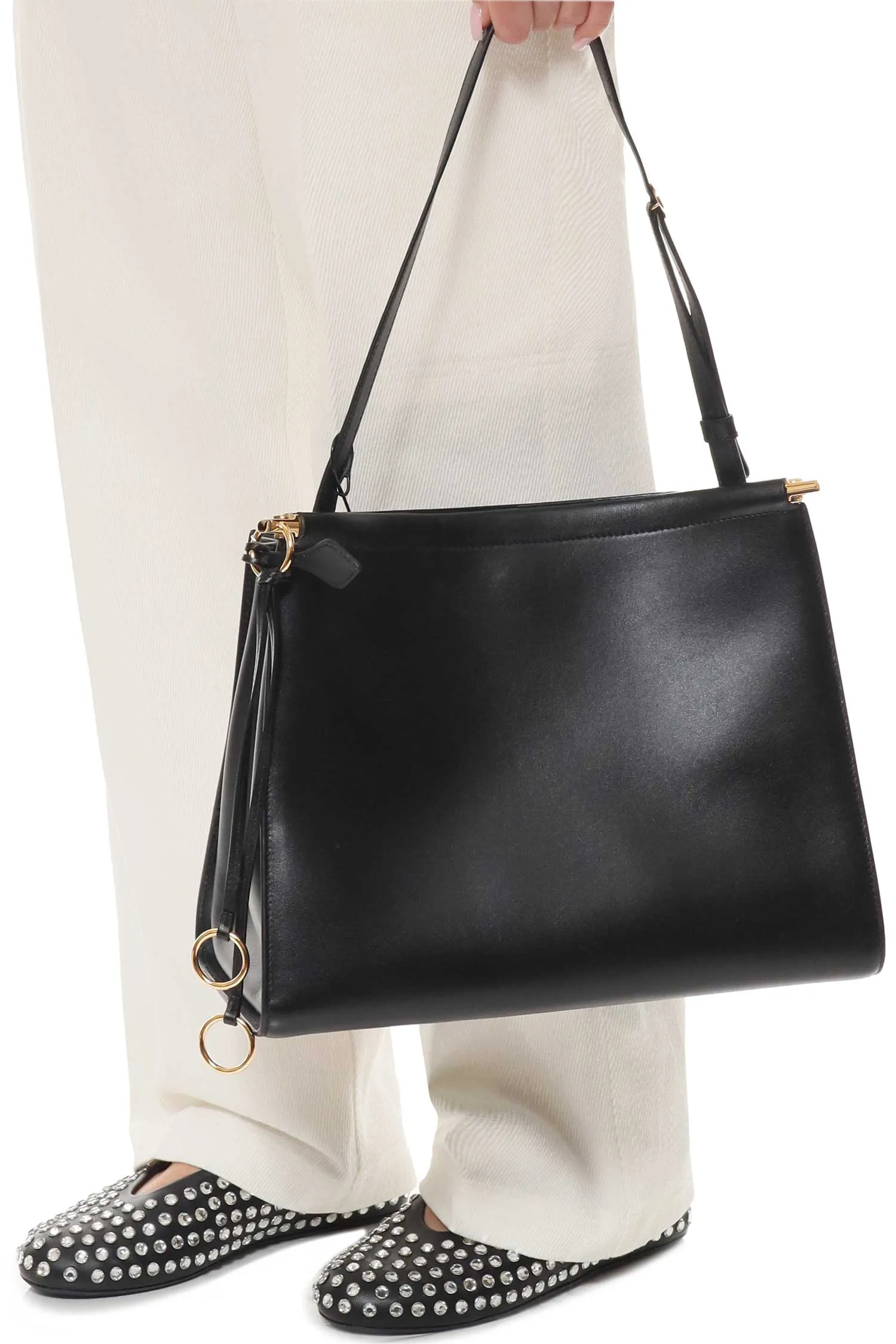 Сумка Le Click Medium — геометричная модель из гладкой телячьей кожи с глянцевым финишем. Имеет удобное основное отделение с магнитной застёжкой, скрытый карман с шарнирным механизмом и фирменную складку в основании. Декоративные кожаные завязки с металлическими кольцами подчёркивают дизайн. Ремешок регулируется, модель носится на плече. Полностью выполнена из телячьей кожи.