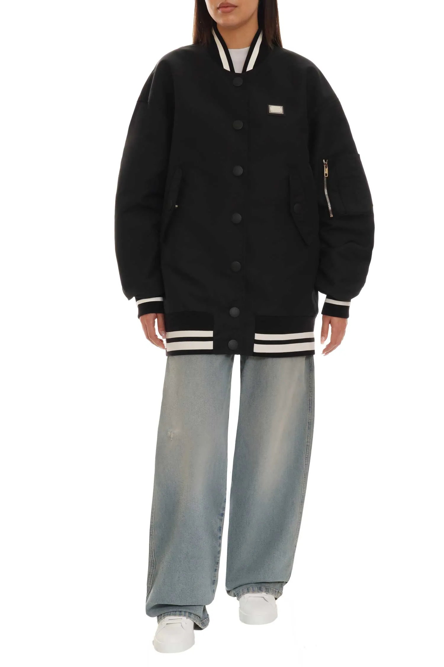 Удлинённая ветровка-бомбер от Dolce&Gabbana — это лёгкая, но выразительная вещь с характером. Чёрный цвет, лаконичный крой и акценты в спортивном стиле — белые полосы на воротнике и манжетах — создают эффектную комбинацию для городского ритма. Присборенные рукава добавляют динамики, а квадратный металлический логотип на груди подчёркивает статус бренда. Модель объёмная, комфортная и стильная, идеально сочетается с кроссовками, массивными ботинками и любимыми базовыми вещами.