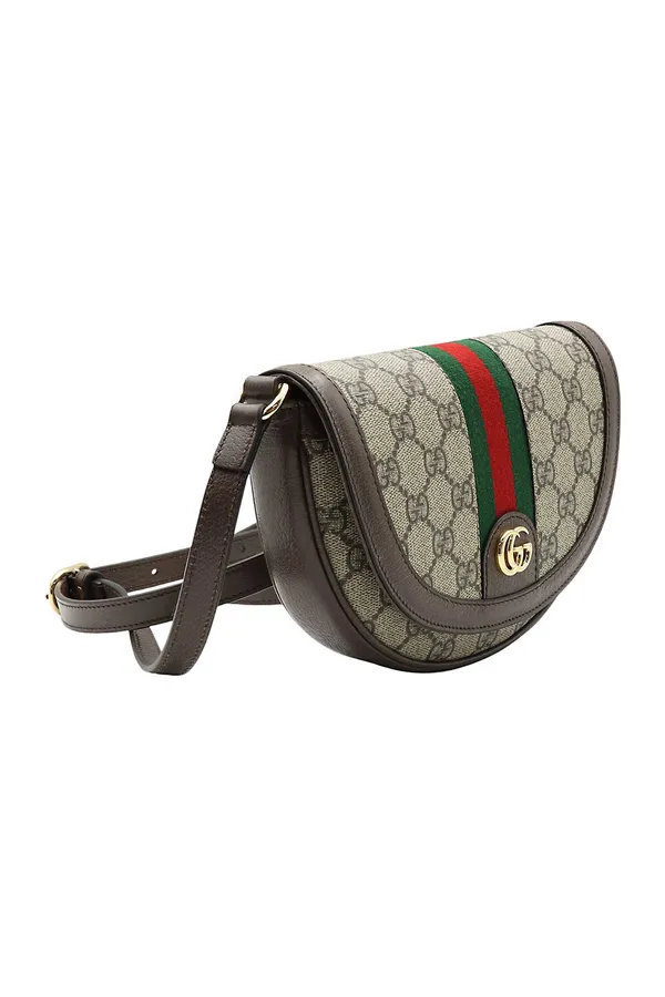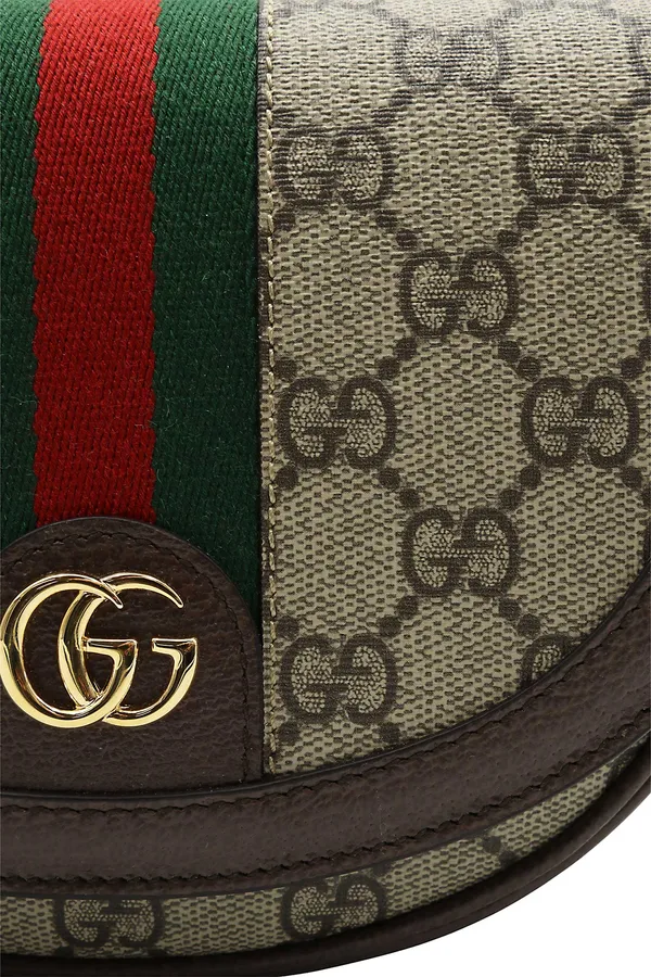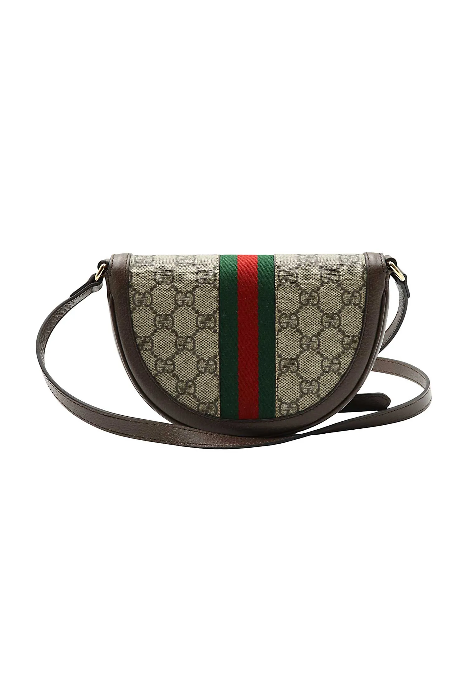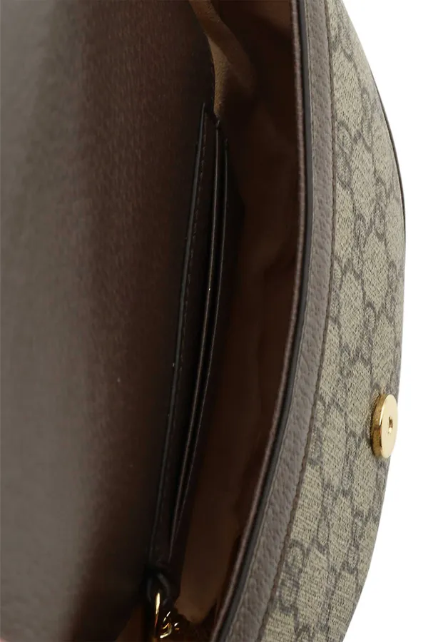СУМКА OPHIDIA GG SMALL БЕЖЕВО-Т/КОРИЧНЕВАЯ В ЛОГО GG, С КЛАПАНОМ, ВЕРТИК.КРАСНО-ЗЕЛЁНАЯ ЛЕНТА WEB, ЗОЛОТИСТ.ЛОГО, РЕМЕШОК