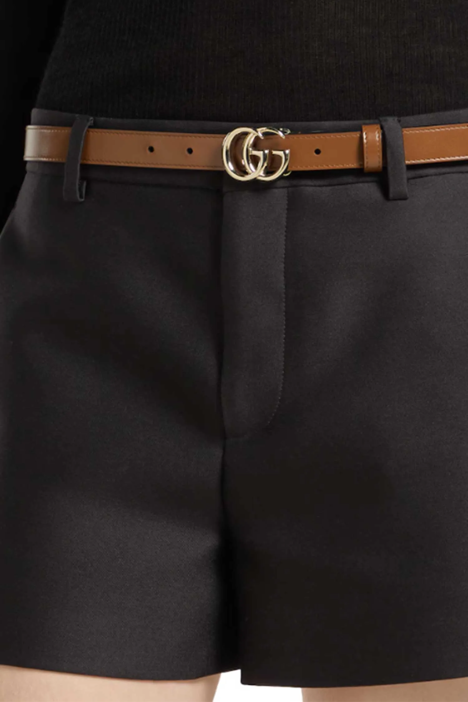 Ремень Gucci GG Marmont — элегантный аксессуар, выполненный из гладкой кожи и украшенный культовой золотистой пряжкой в форме двойной буквы G. Узкая модель с лаконичным силуэтом гармонично дополняет как повседневные, так и вечерние образы. Изготовлено в Италии.