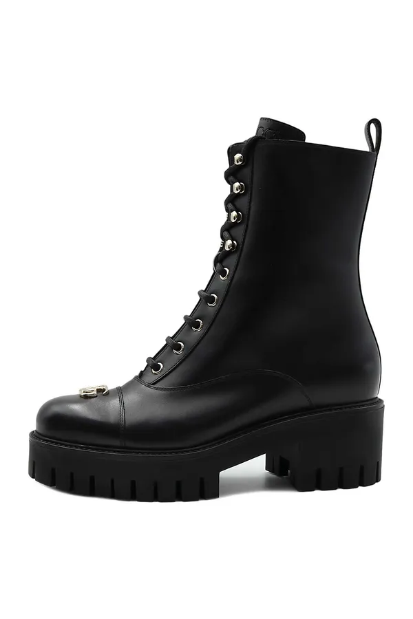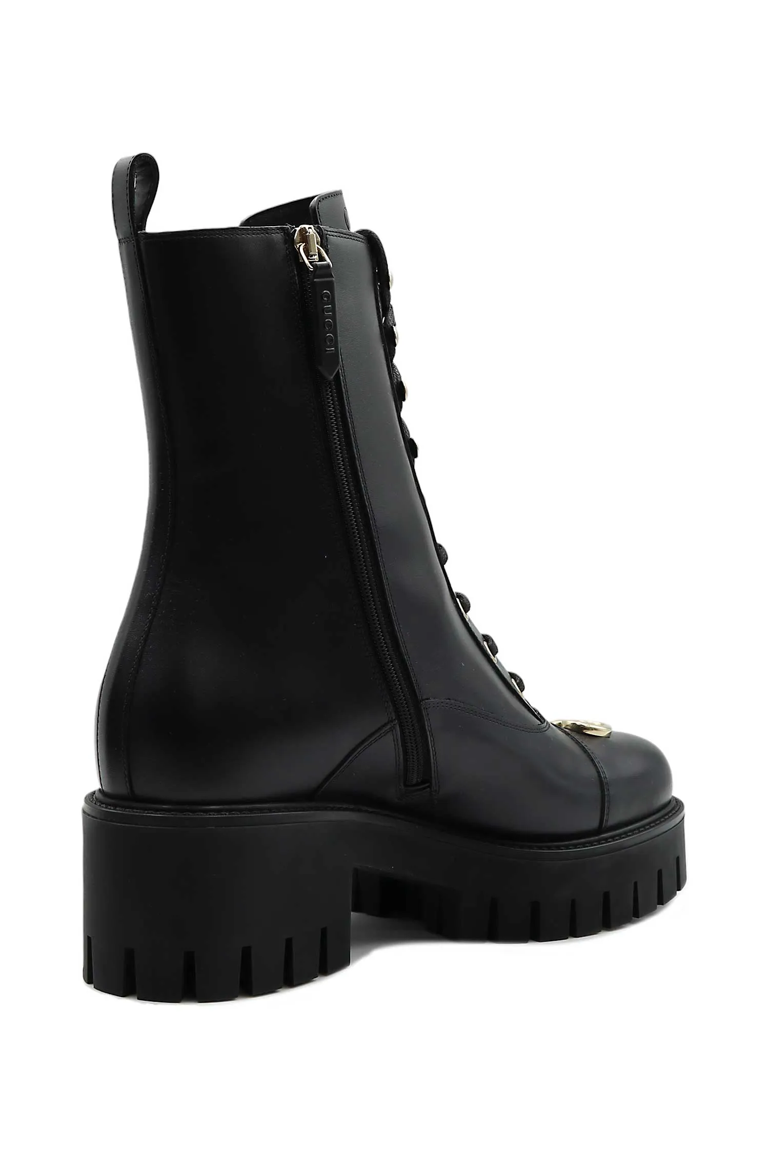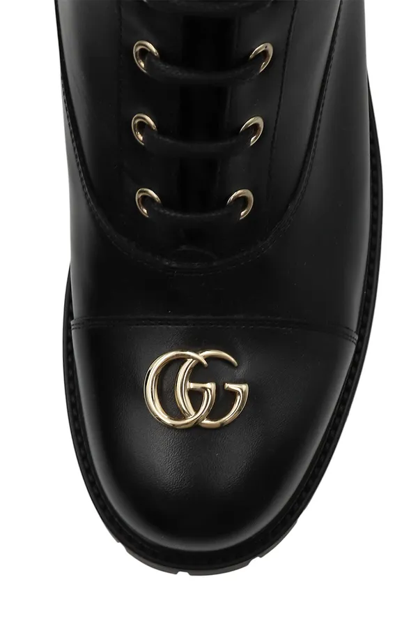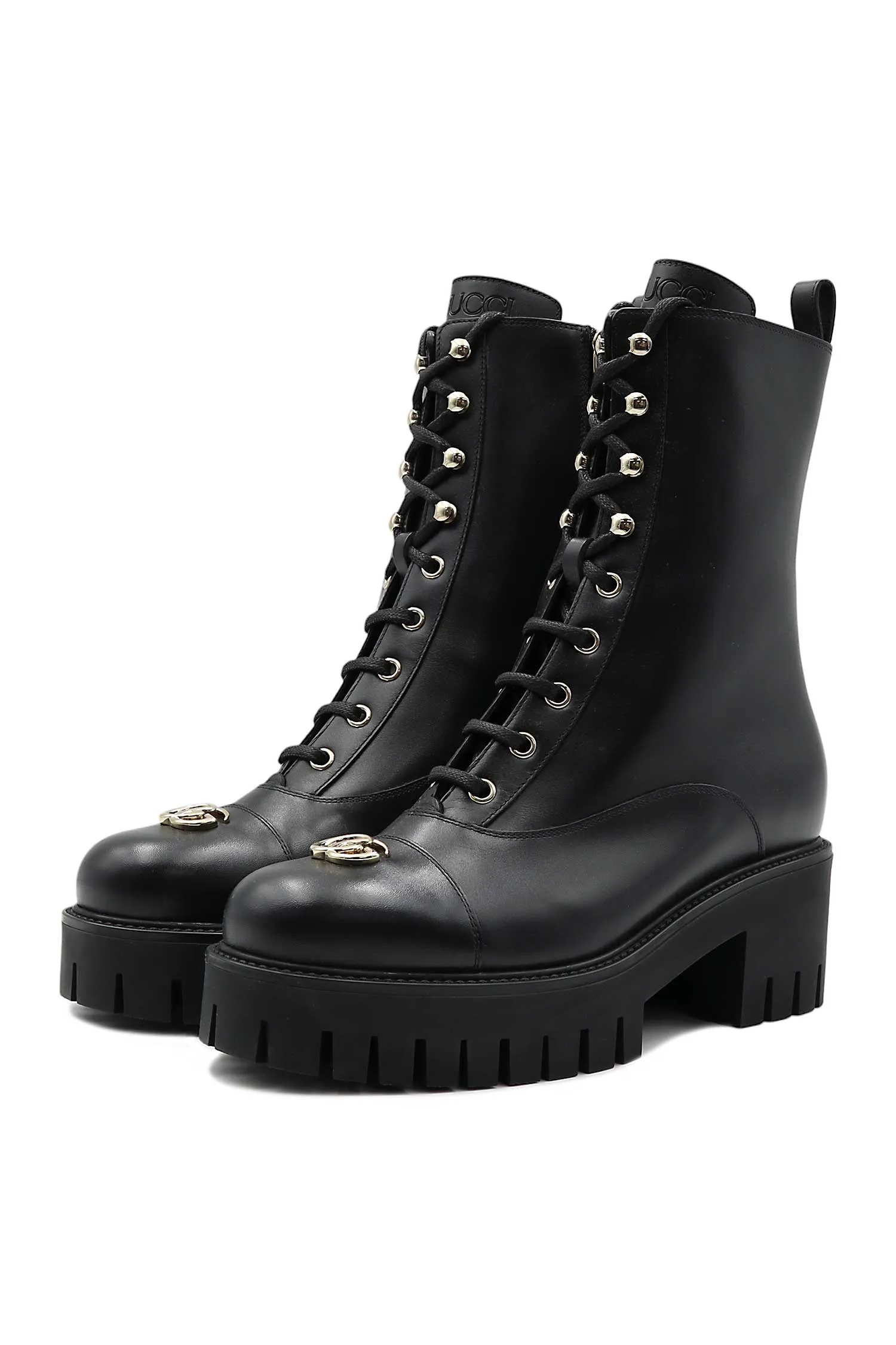 БОТИНКИ ЧЁРНЫЕ НА ШНУРОВКЕ, СБОКУ МОЛНИЯ, НА НОСУ ЗОЛОТИСТОЕ ЛОГО GG, ТРАКТОРНАЯ ПОДОШВА, К=6