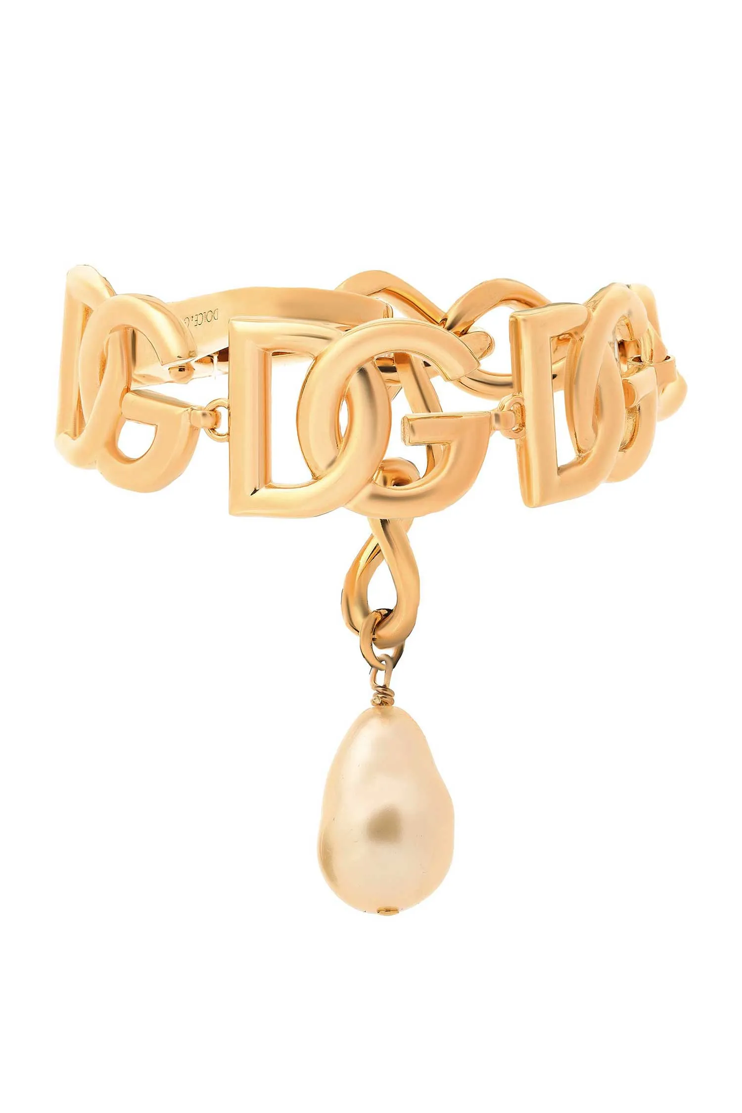 БРАСЛЕТ ЗОЛОТИСТЫЙ ИЗ КРУПНОГО ЛОГО DG, ПОДВЕСКА С БАРОЧНЫМ ЖЕМЧУГОМ
