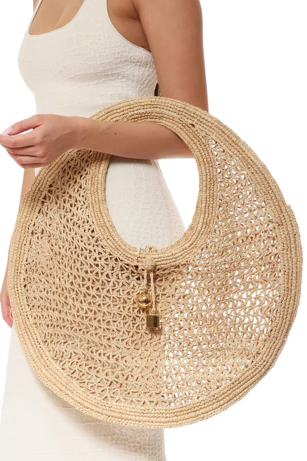 Сумка Jacquemus Le Rond Spiaggia выполнена вручную из натуральной рафии и имеет выразительную круглую форму. Плетёная текстура подчёркивает летний характер модели, а укреплённые края обеспечивают износостойкость. Дополнением служат золотистые геометрические подвески, которые создают изящный акцент. Лёгкая и вместительная, эта сумка станет стильным спутником для отдыха и городских прогулок.