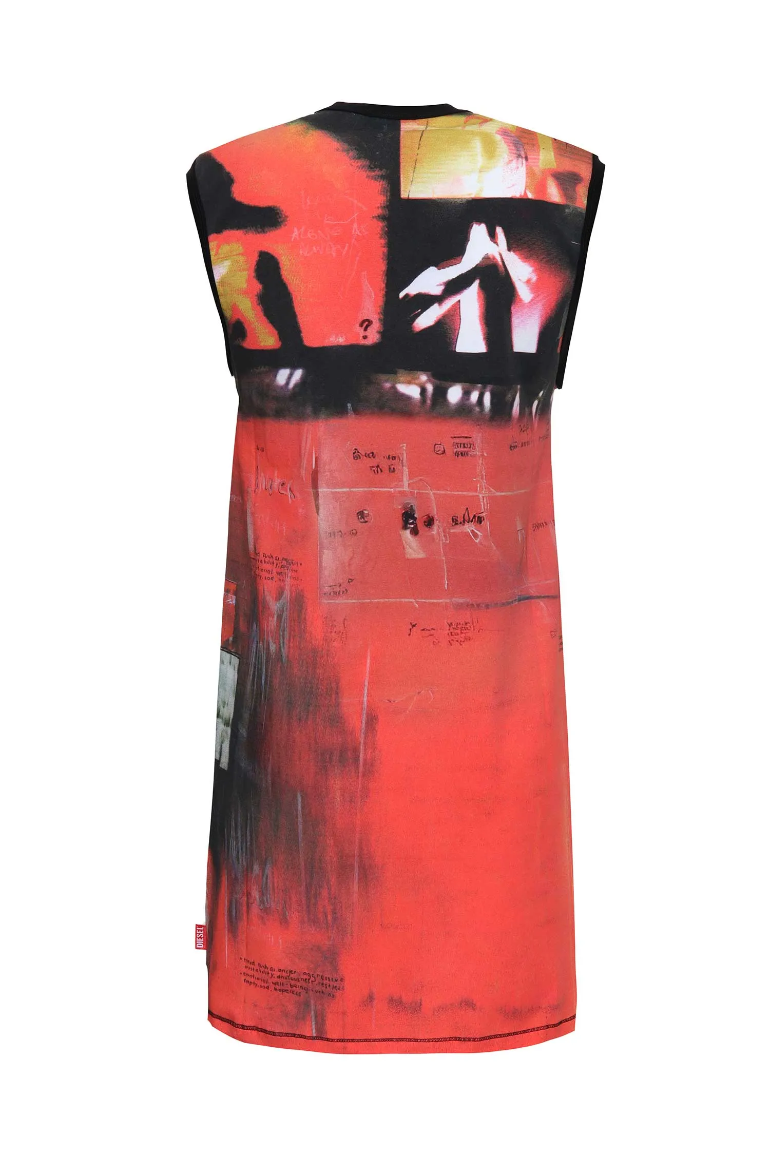 ПЛАТЬЕ КРАСНО-СЕРОЕ, ПРИНТОВАННОЕ, КОРОТКОЕ, ЧЁРНАЯ ОКАНТОВКА, Б/РУК.