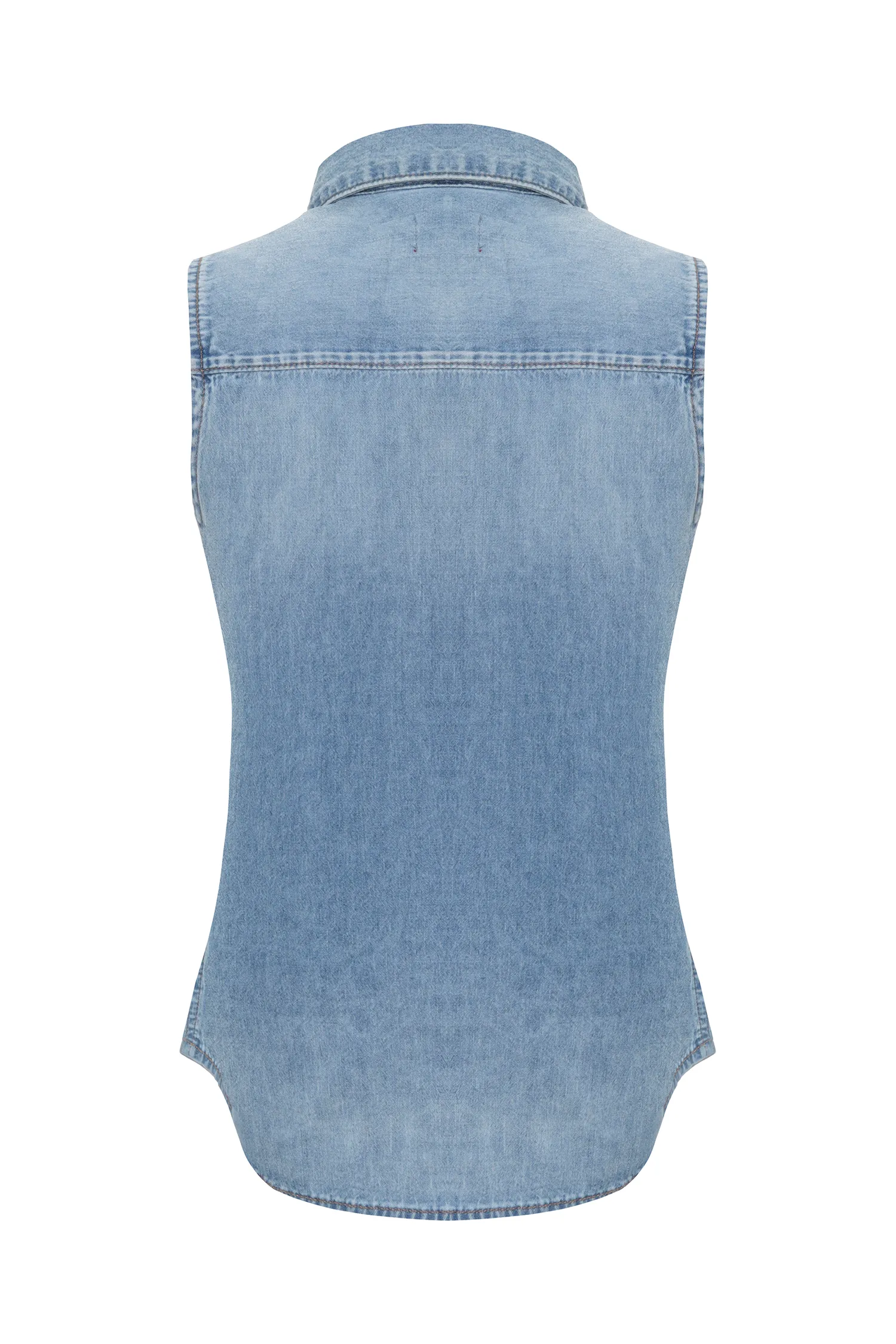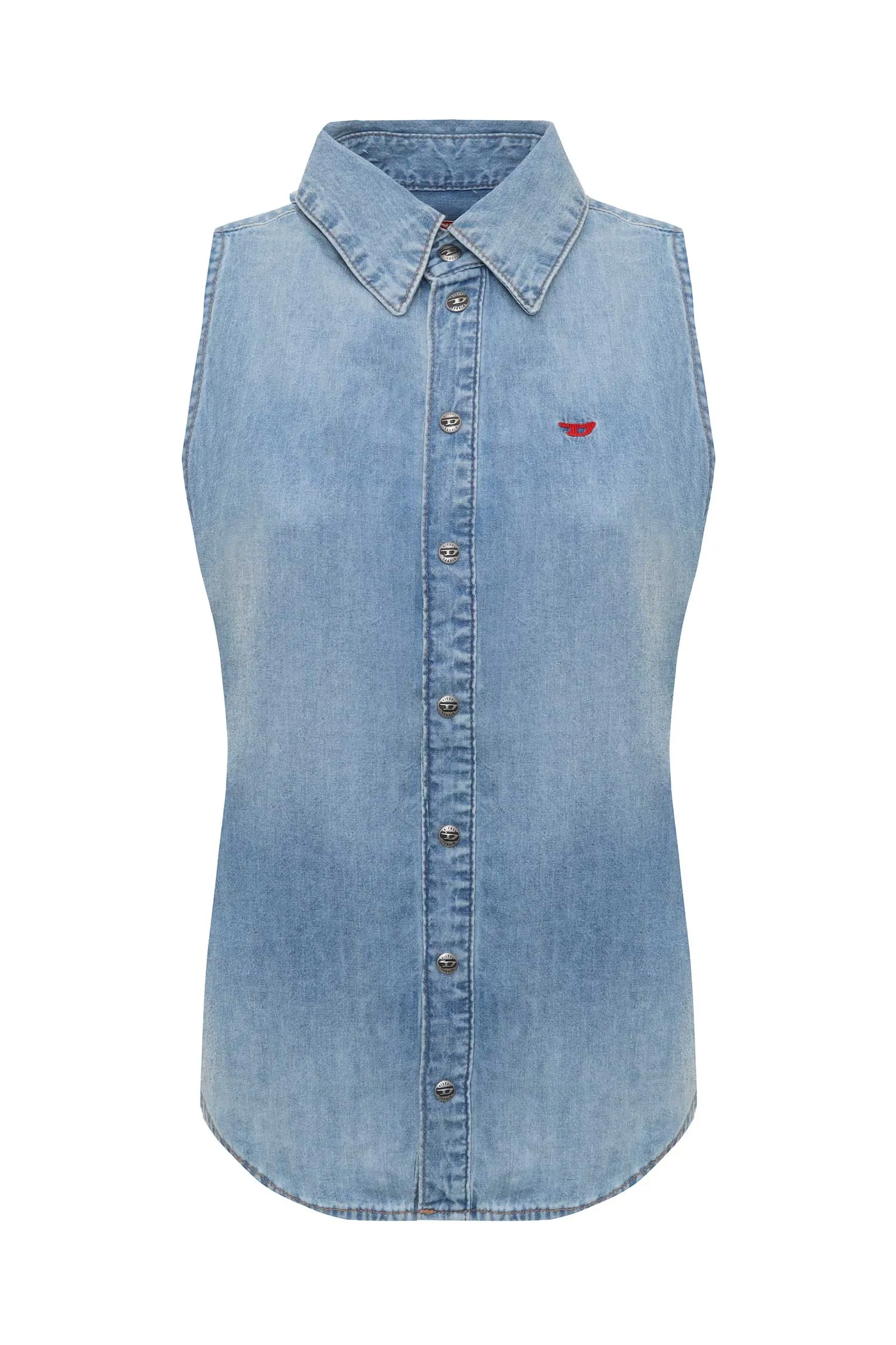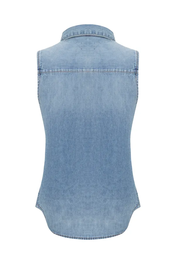 РУБАШКА ГОЛУБАЯ, ДЖИНСОВАЯ, ВЫБЕЛЕННАЯ, НА ГРУДИ ВЫШИТОЕ КРАСНОЕ ЛОГО, Б/РУК.