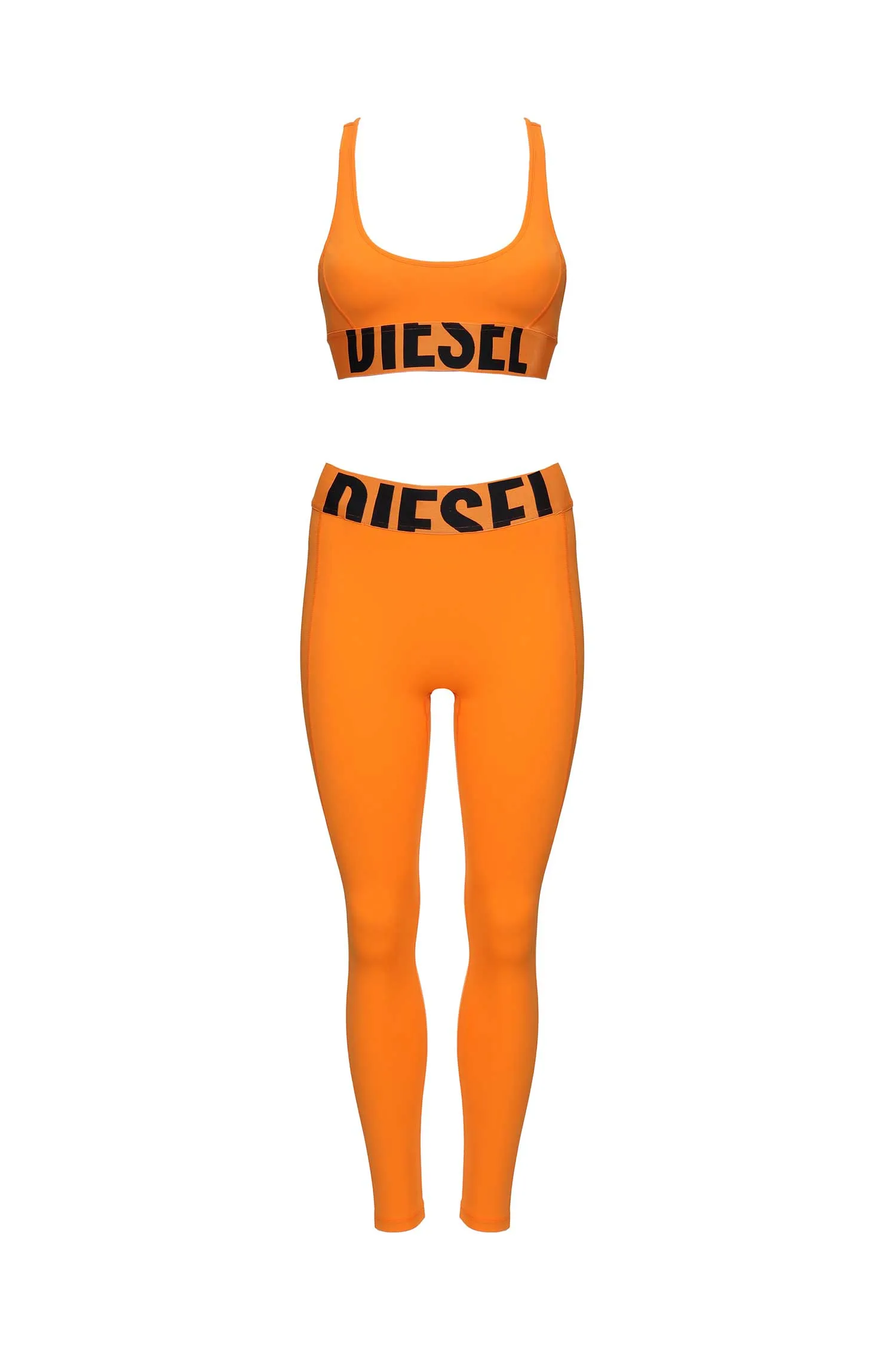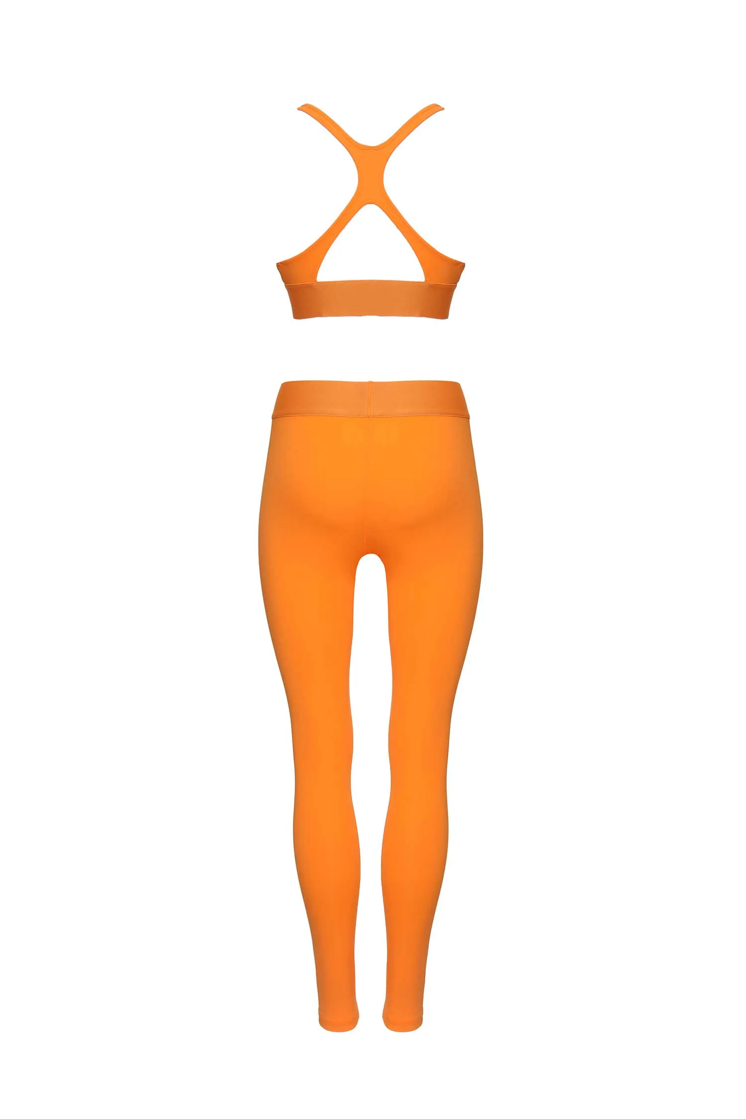 КОСТЮМ ОРАНЖЕВЫЙ, ЭЛАСТИЧНЫЙ, ТОП УКОРОЧЕННЫЙ+ЛЕГИНСЫ, НА РЕЗИНКЕ КРУПНАЯ ЧЁРНАЯ ЛОГО-НАДПИСЬ