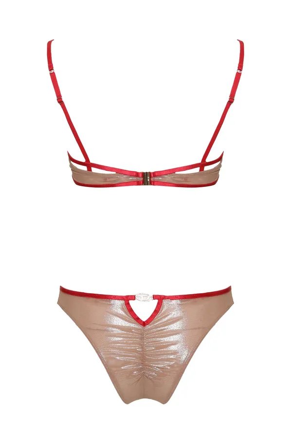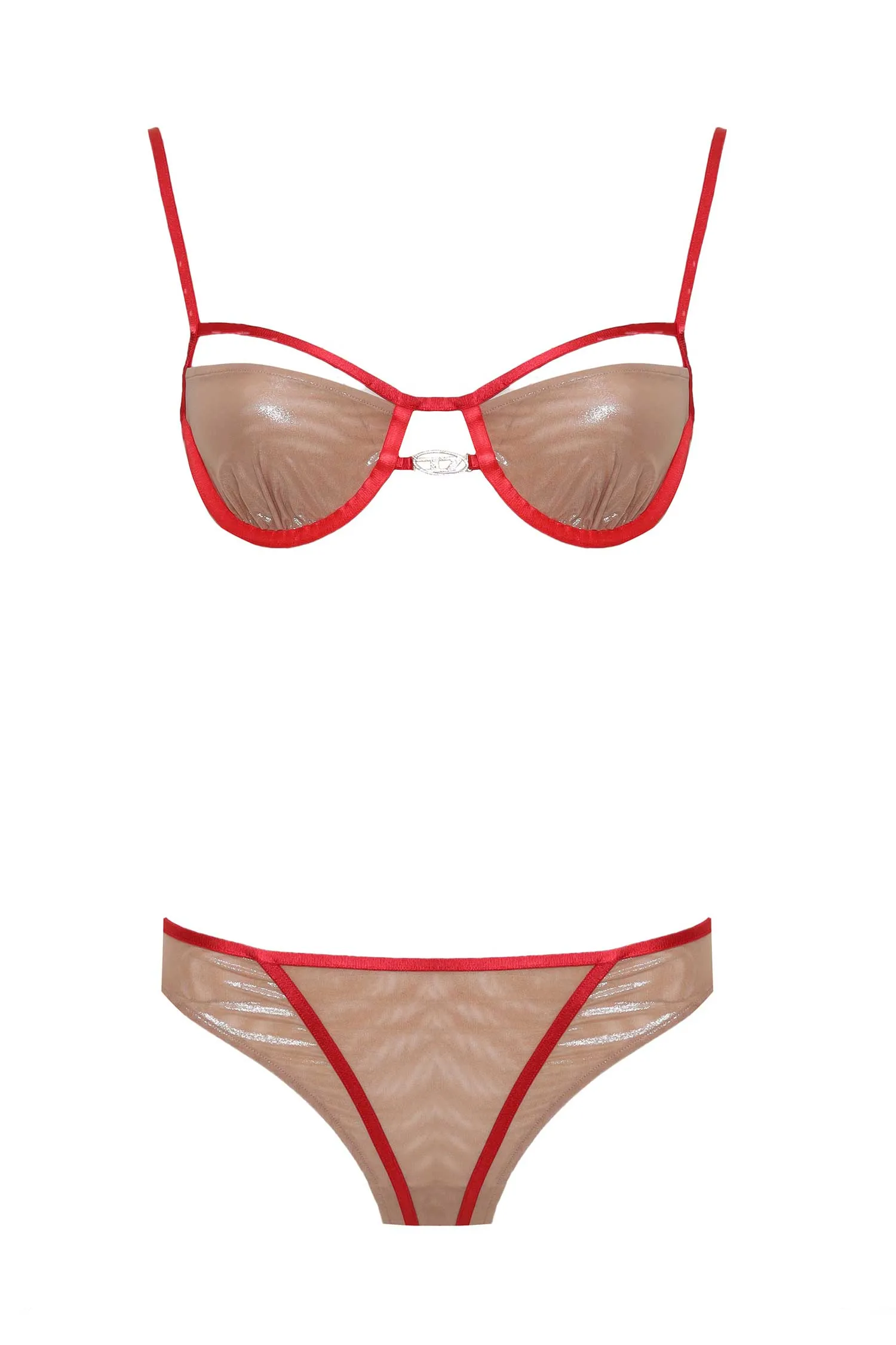 КОМПЛЕКТ БЕЖЕВЫЙ С КРАСНОЙ ОКАНТОВОКЙ, ЛИФ+ТРУСЫ С ВЫСОКОЙ ПОСАДКОЙ, БЛЕСТЯЩИЙ, ЗОЛОТИСТОЕ ЛОГО В СТРАЗАХ